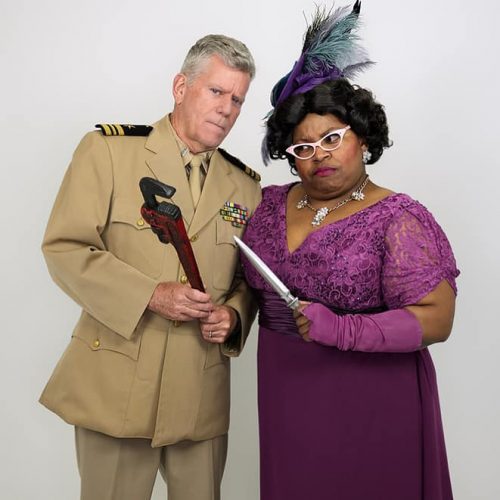 In the role of Wadsworth, the butler (played by Tim Curry in the film), Guest Artist and LA-based Actors’ Equity Association veteran Louis Lotorto delivers an initially nuanced performance that rockets into the comedic equivalent of a fireworks finale. Other appearing Guest Artist/AEA Members are Matt K Miller (last seen as Buddy the Elf’s father Walter Hobbs in SRT’s recent production of Elf the Musical), who plays dense military blowhard Colonel Mustard, and Ileana Kirven as batty, neurotic senator’s wife Mrs. Peacock.
