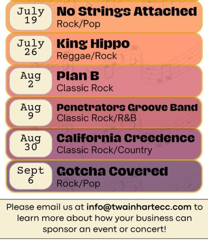 Dance the night away under the pines as rockin’ tunes meet the sunset in Eproson Park. Celebrate our local talent and beloved town throughout the summer. This FREE event draws a crowd full of vacationers and locals alike! Email info@twainhartecc.com to sponsor a concert.