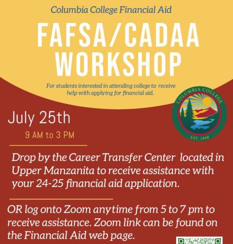 Columbia College is hosting another FAFSA/CADAA Financial Aid Application Workshop day on the Columbia College campus in the Career and Transfer Center, located in the upper Manzanita building to help those last minute students and potential new students get their applications completed.