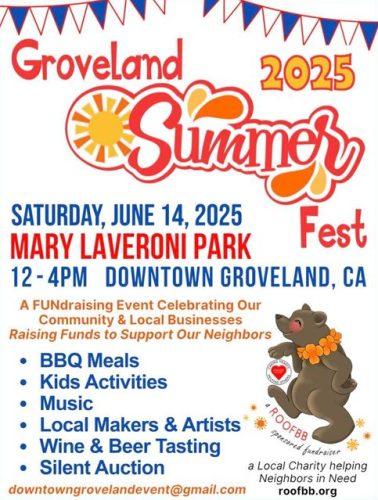 Saturday, June 14th from noon-4pm. This Groveland community event is FREE to the public. This summertime festival is hosted by ROOFBB, a local non-profit raising funds to help our local schools, community projects, and neighbors in need. Bring the whole crew! SummerFest! has something for everyone: Kids activities, delicious eats, community vibes, and a whole lot more, It’s family-friendly, and full of fun. #roofbbcharity #roofbb #grovelandsummerfest #summerfest2025 #grovelandca #visitgrovelandca #summertimefun