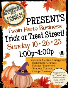 Ghosts, ghouls, and more will join us as we close off the streets of Downtown Twain Harte to celebrate Halloween! The Twain Harte businesses will be handing out candy and treats to trick-or-treaters, and participants are welcome to join our costume contests. Businesses will also participate in a “people’s choice” decorating contest.