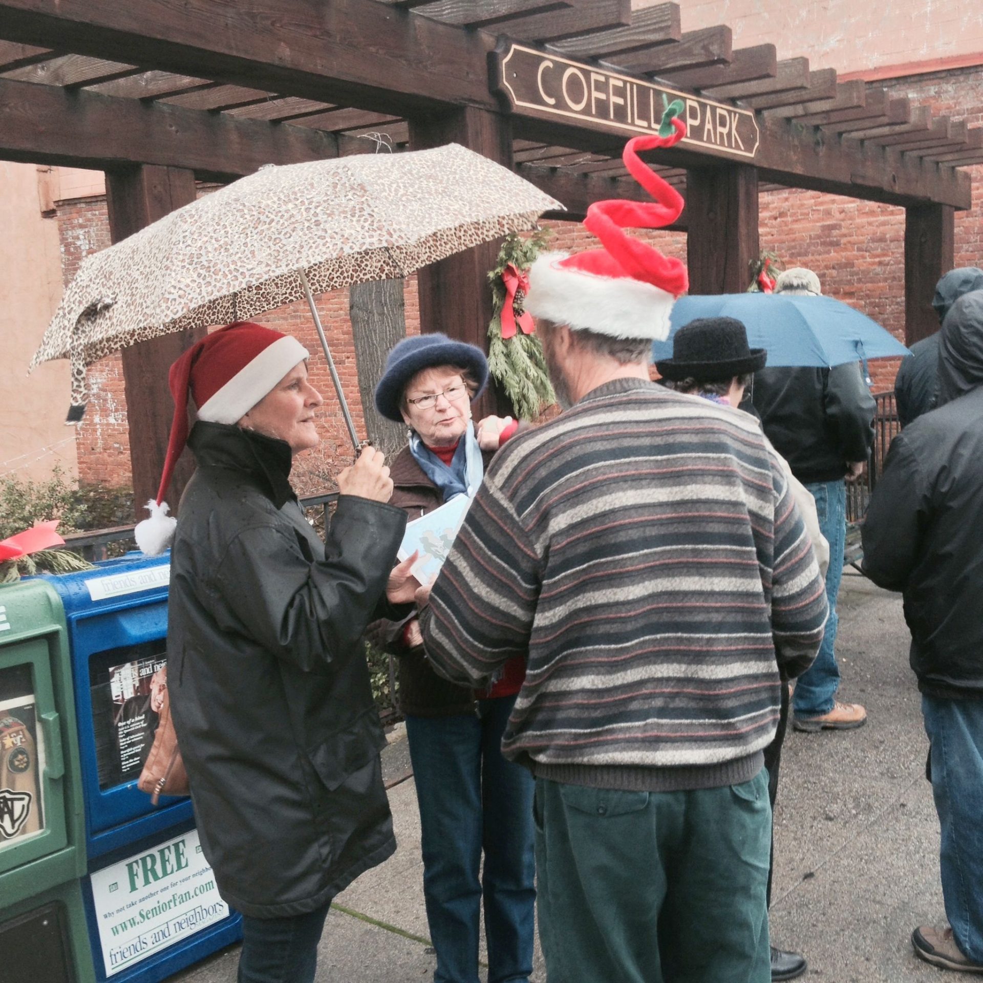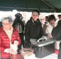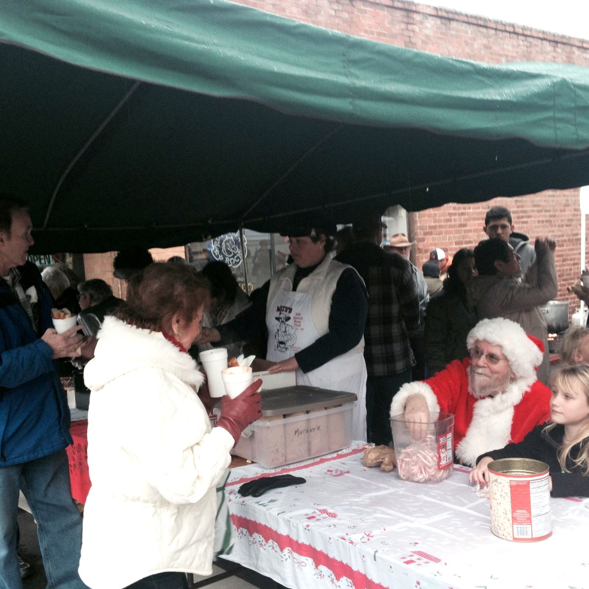 Among the volunteer servers, Connie Birdsall of Sonora, says she has been spooning up beans for “only about four years.” As folks file in and head down the line for their share of the free feast of cold weather comfort foods, she describes the drill to them. “This is menudo, it’s a Mexican soup, made with tripe, and we have fresh bean soup back here, French [garlic] bread, we have tortillas and quesadillas, popcorn, and Santa Claus will give you some candy canes.”