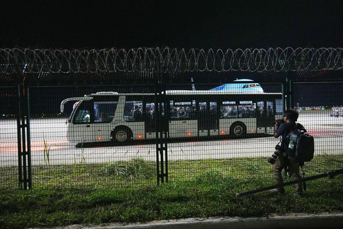 Cambodian Interior Ministry spokesperson Touch Sokhak said earlier that 64 South Koreans were to be repatriated from Cambodia late Friday. After their chartered plane landed at South Korea’s Incheon International Airport on Saturday morning, the returnees were seen in handcuffs, each escorted by police officers on both sides, as they were led to a parking area where security vehicles were waiting to transport them.