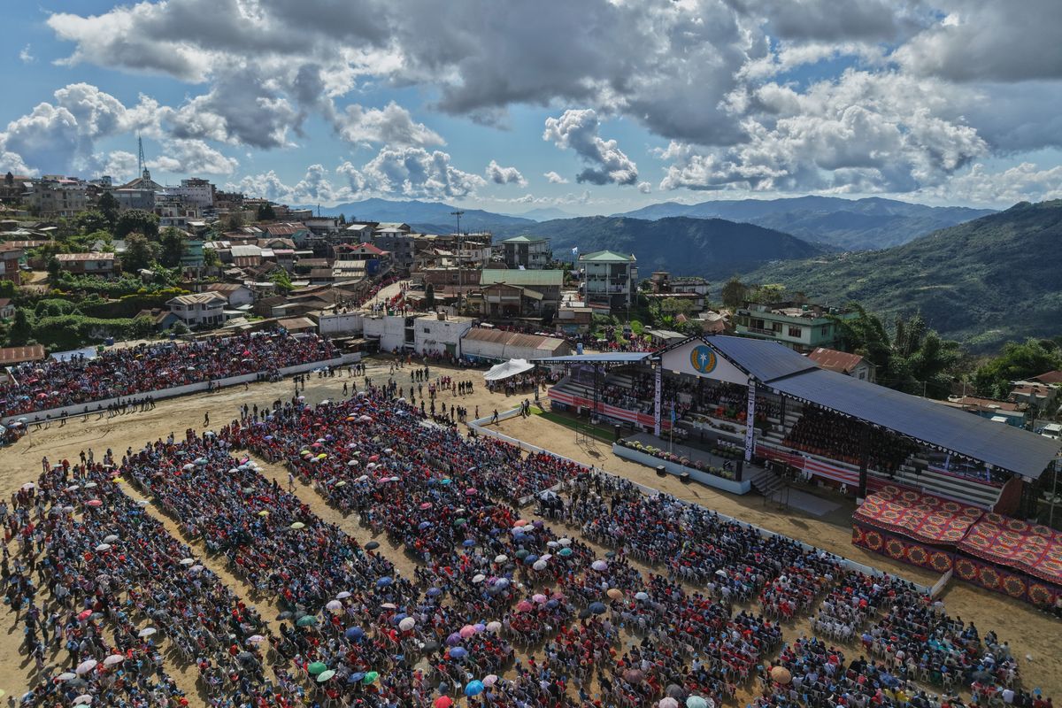 Men and women in traditional Naga attire carrying spears and wearing feathered headgear welcomed the 91-year-old Muivah in Manipur’s Ukhrul district. Schoolchildren waved the Naga flag, which has a blue background with a rainbow across the center and a white star in the top left corner.