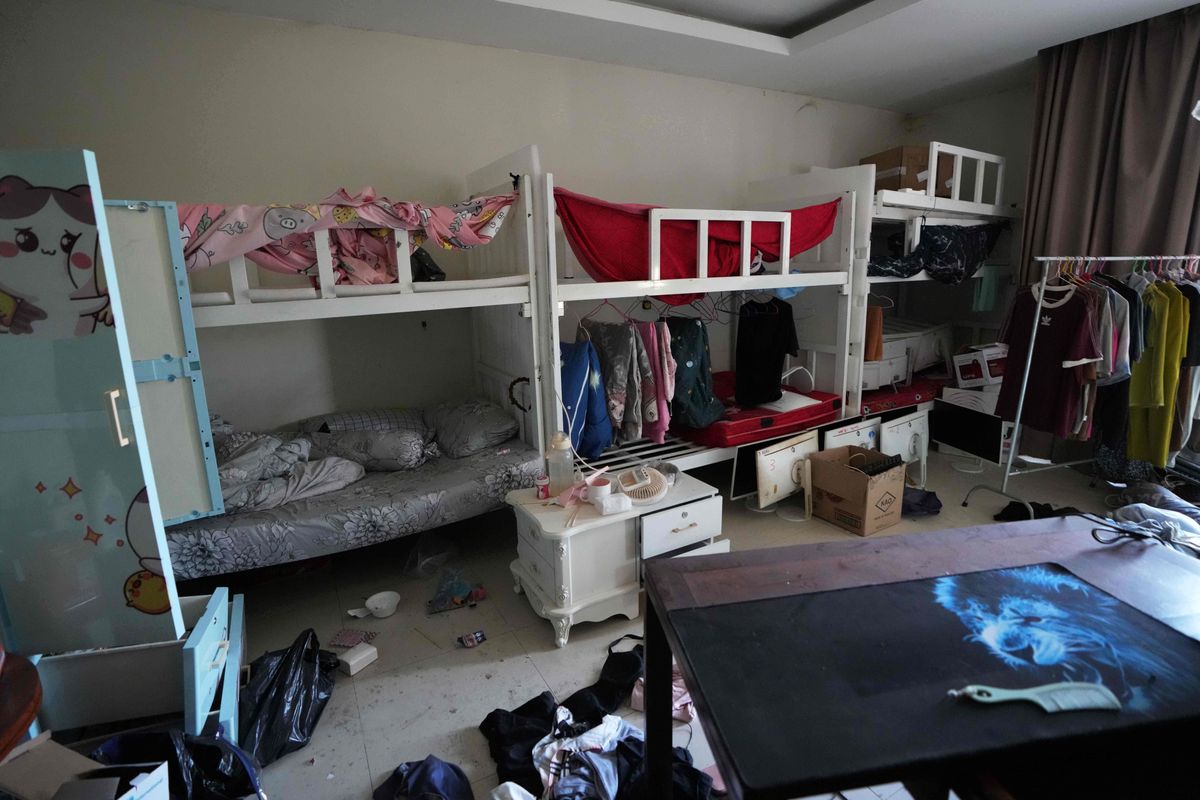 Images show abandoned belongings and mock police stations at a former scam center in Asia