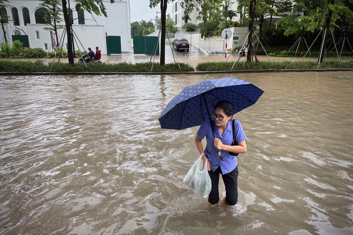 “It’s flooding everywhere because it has been raining so much. I’m stuck here and can’t get to work,” said Nguyen Thu Quynh, an office worker who pushed her motorcycle out of a street flooded with knee-deep water.
