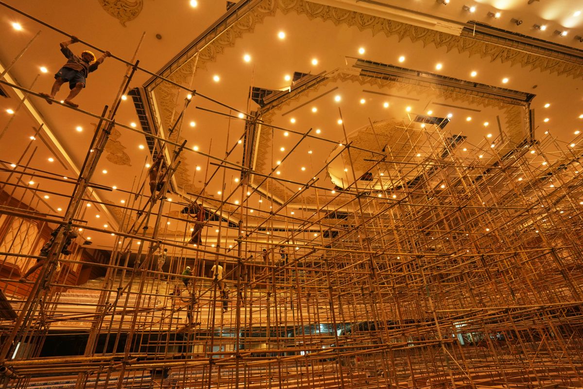 At the parliament complex in Naypyitaw, up to 500 people are working day and night, seven days a week, on the five most important buildings that were damaged. Crews are repairing collapsed ceilings and walls and shoring up foundations so they will be usable in time for elections scheduled for the end of December. Scaffolding fills entire chambers.