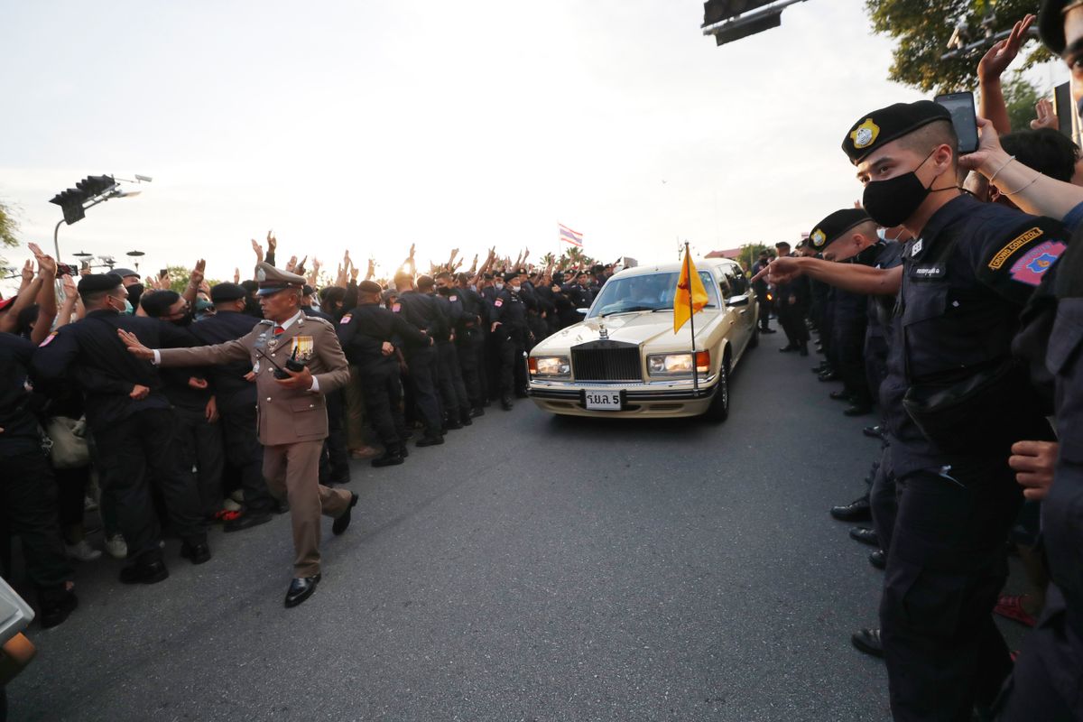 Prosecutors had alleged that the five knew that the royal motorcade — with a limousine carrying Queen Suthida, the wife of King Maha Vajiralongkorn, and his son, Prince Dipangkorn Rasmijoti, then 15 years old — was due to pass the area and that they had tried to block its route.