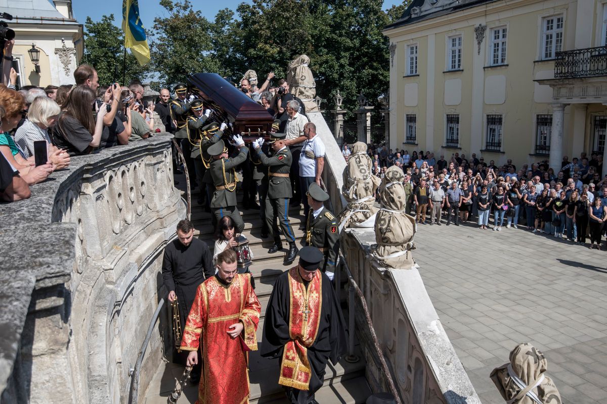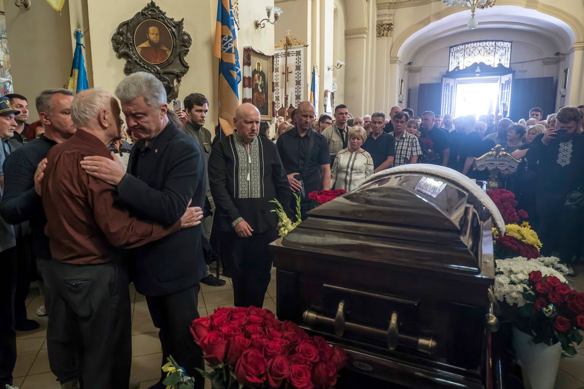 Parubiy’s coffin was carried in a procession to Lviv’s central square for a ceremony before he was buried at Lychakiv Cemetery, the resting place of many of the city’s most renowned figures.