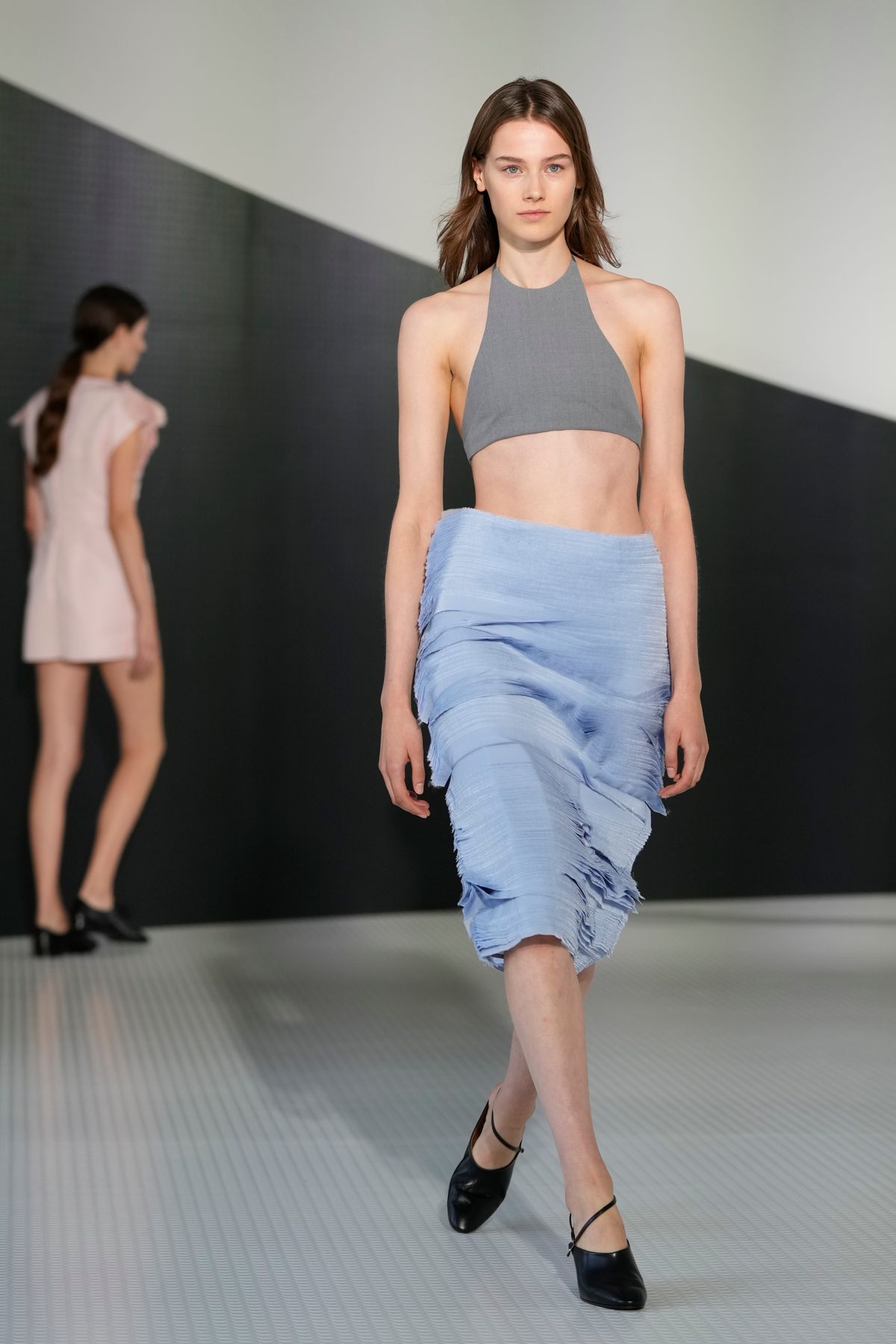 Cropped knitwear had an almost shrunken feel, with three-quarter length sleeves layered over lighter plies. Slits across the bodice burst open into to gaping holes that revealed sequin or pleated bralettes. A series of Georgette crepe dresses appeared assembled from raw-edged strips, which the studious designer said were meant to recall the pages of a book.