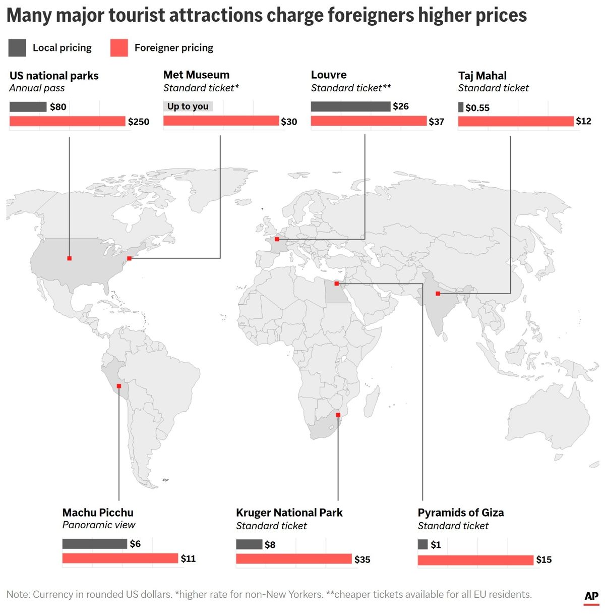 Elsewhere in Europe, the standard entry to Rome’s Colosseum, along with the Forum and Palatine Hill, is 18 euros ($20), and an adult ticket for Athens’ Acropolis is 30 euros ($33).