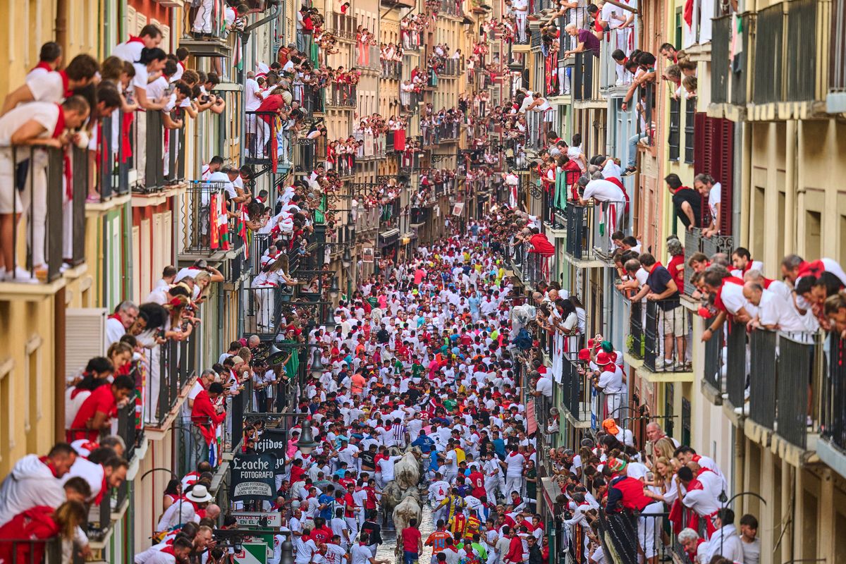 A tiny minority of those who run with bulls are women, and while goring is not rare, more get injured in falls and pileups. Medics rush in to treat the injured and take the seriously hurt to a hospital.