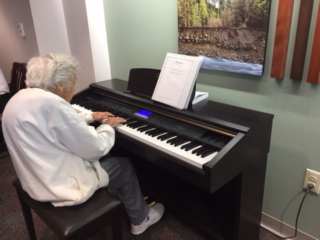 Today, June still volunteers with the hospital by assisting with Baby Track and playing the piano in the hospital cafeteria. She also mends clothing at the Sonora location of Dorcas International, plays the organ for her church, and helps with a local class that provides information and help to those suffering from depression.