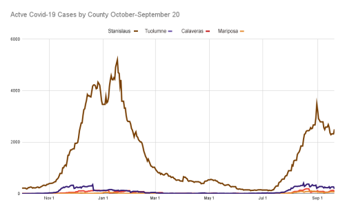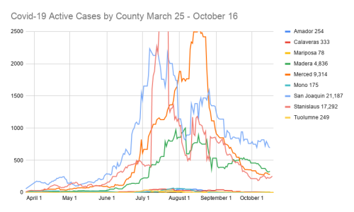 *Active cases as reported by the county or recovered and deceased minus total. For Mono County new cases with in the last 14 days and for San Joaquin a rolling 14-day total of cases which is less than their total minus recovered and deceased.