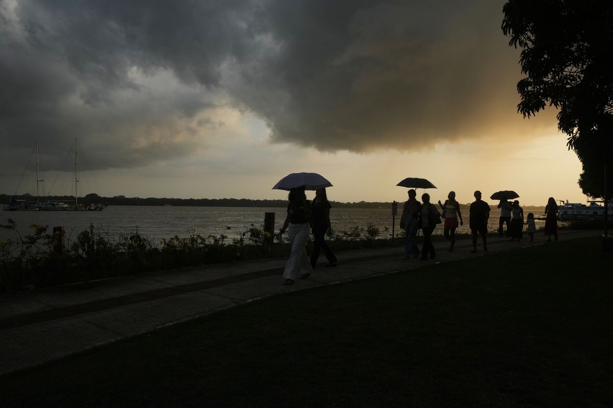 An Indigenous group attended the opening ceremony of the People’s Summit offsite from the COP30 climate conference, while other people walked along the river at sunset in Belem, Brazil. Jose Rivera prayed before an image of the Virgin Mary painted on a tree in Armero, Colombia, the day before the 40-year anniversary of the Nevado del Ruiz volcanic eruption that killed about 25,000 people and wiped out the town.