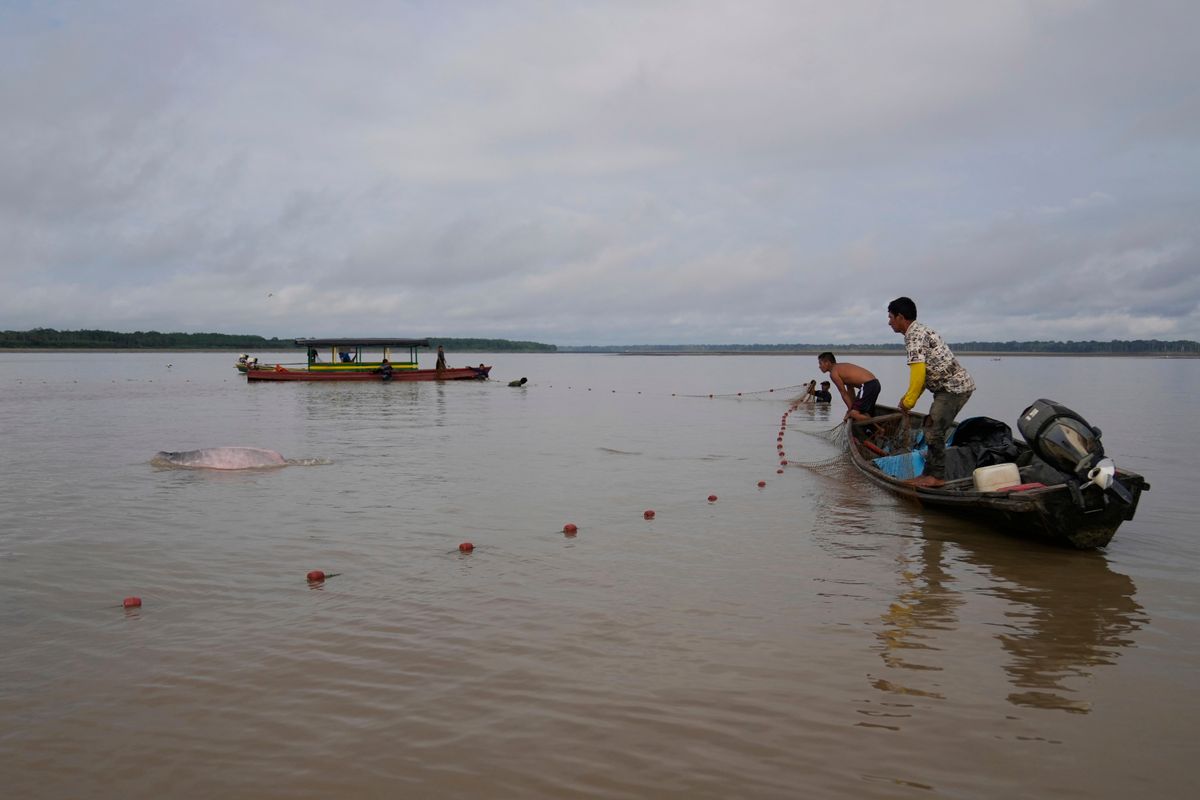 PUERTO NARINO, Colombia (AP) — A flash of pink breaks the muddy surface of the Amazon River as scientists and veterinarians, waist-deep in the warm current, patiently work a mesh net around a pod of river dolphins. They draw it tighter with each pass, and a spray of silver fish glistens under the harsh sun as they leap to escape the net.