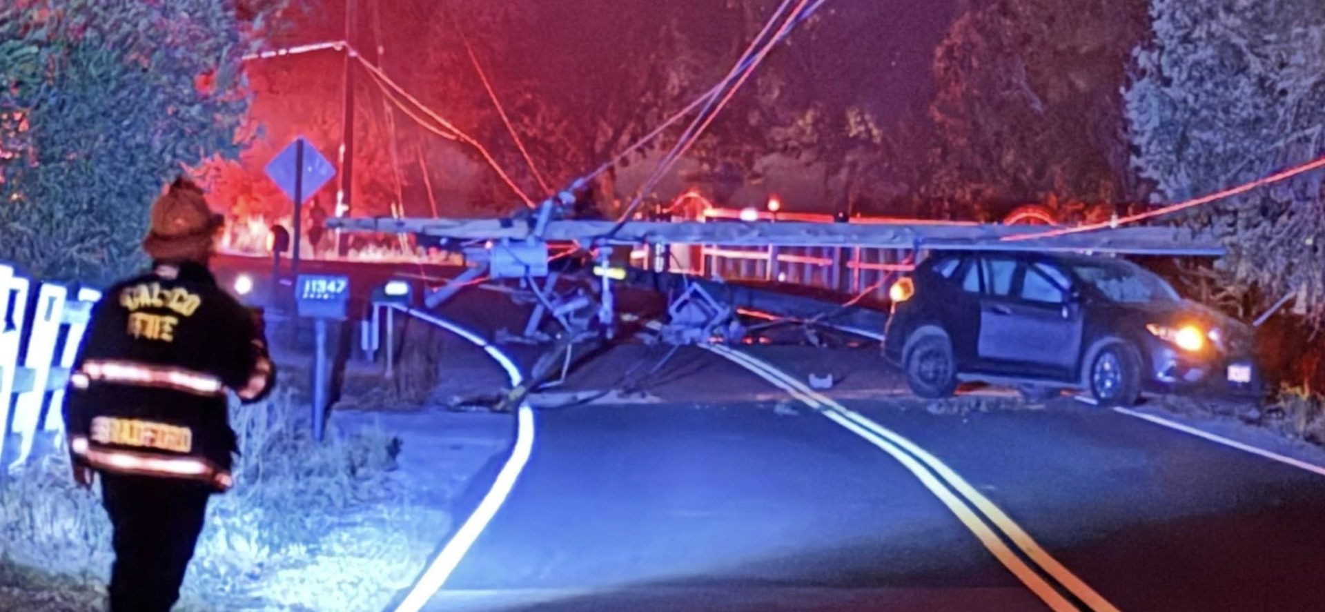 Calaveras Consolidated Fire (CCF) firefighters responded to the collision at the intersection of Milton Road, Mann Street, and Jenny Lind Road, south of Highway 26, at around 10 p.m. The image shows a downed power pole that fell onto a compact car. In fact, CCF reports that the car actually hit two power poles.