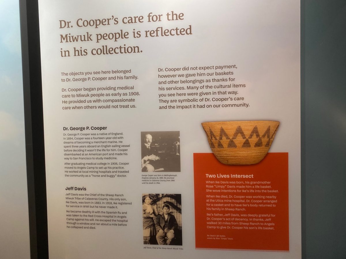 The primary collection of baskets and artifacts on display came from the family of Dr. George P. Cooper of Angels Camp. It was noted that he was the only doctor at the turn of the century (starting around 1908) who would provide local medical care to the Miwuk people in the Sierra Foothills. He did not expect payment, but many tribal members would give him baskets and other belongings as a show of thanks.