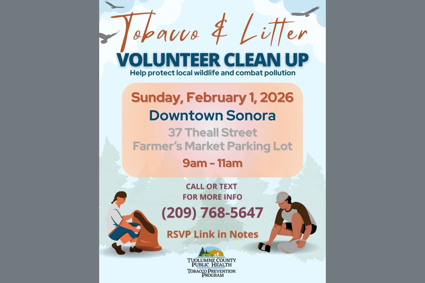 This weekend, local health officials are holding a Tobacco & Litter Volunteer Clean Up event in downtown Sonora to address garbage, tobacco waste, and other pollutants. The event for Winter 2026 will be Sunday, February 1, 2026, from 9 a.m. to 11 a.m., meeting at the Farmer’s Market parking lot at 37 Theall Street near the mural in the parking lot. Gloves and trash bags will be given to each volunteer at the event. Health officials recommend volunteers bring sunscreen and wear clothes and shoes appropriate for the outdoors, steep terrain, and inclement weather.
