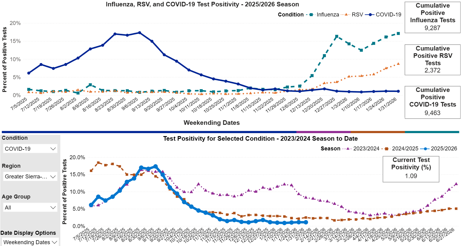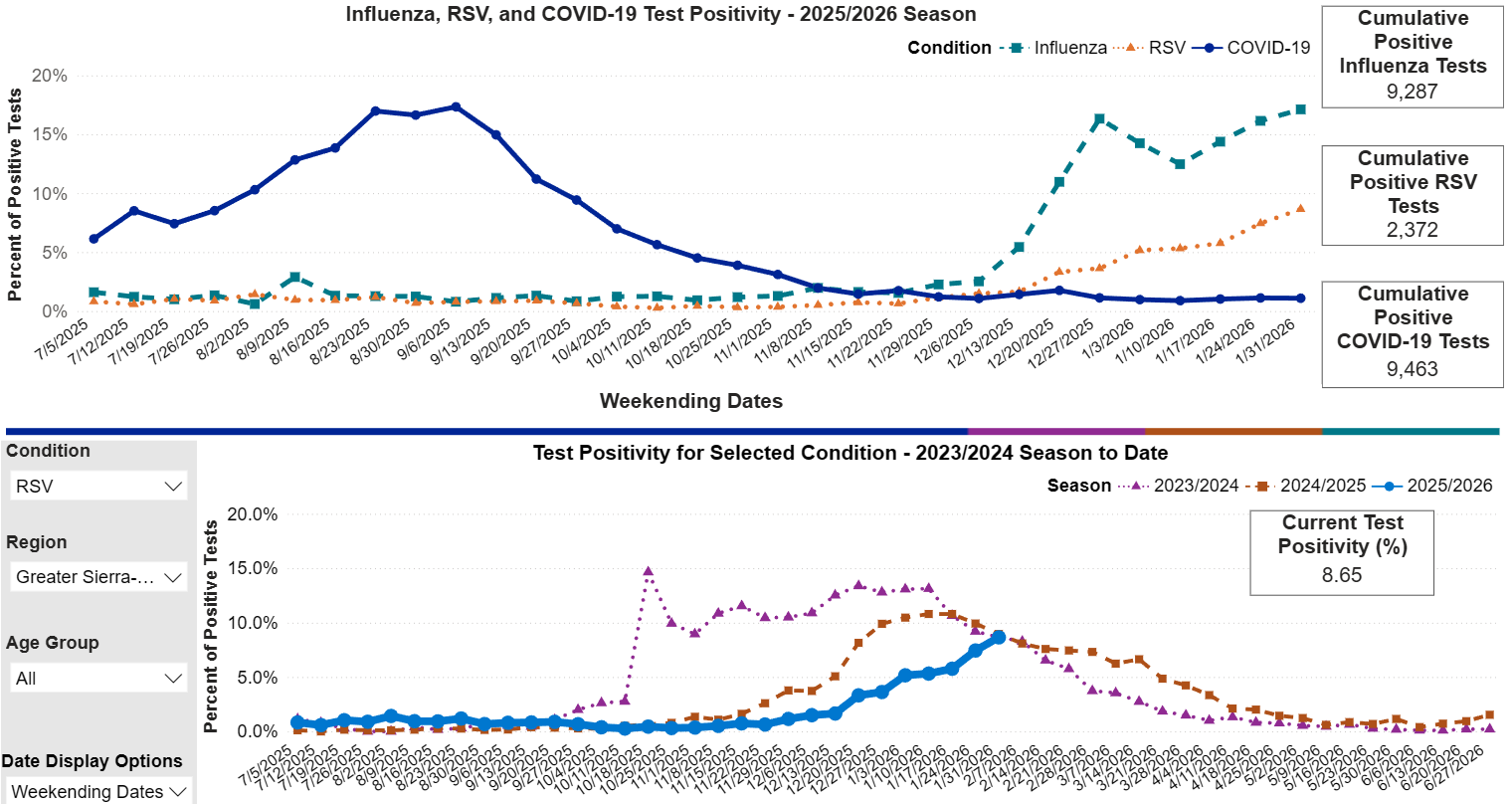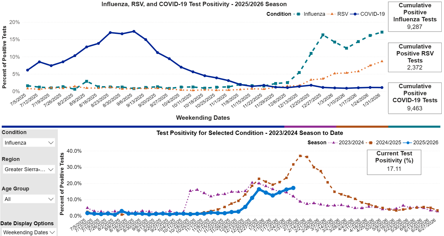 Tuolumne County, CA — Respiratory virus season is still here according to the Tuolumne County Public Health Department. Tuolumne County Health Officer Dr. Kimberly Freeman notes that Tuolumne’s numbers of cases tend to lag slightly behind the valley data that California Public Health groups us with. Freeman monitors the weekly test numbers from local hospitals and clinics and notes that Influenza A reached a seasonal peak last week and is down 30-percent. She noted flu cases spiked after the Covid-19 mask mandates ended in 2021 and most recent seasons have not been nearly as bad. Currently, only 5-percent of tests are positive for Influenza B. In addition to Influenza, RSV and Covid-19 are tracked as well. Covid-19 is currently low in the area an was higher in the summer. RSV is high but also trending slightly down, Freeman noted respiratory virus season normally continues until about April. The three illnesses generally impact breathing and do not involve vomiting or the digestion. Illnesses like strep throat and norovirus, which often cause upset stomach, are not tracked by public health.