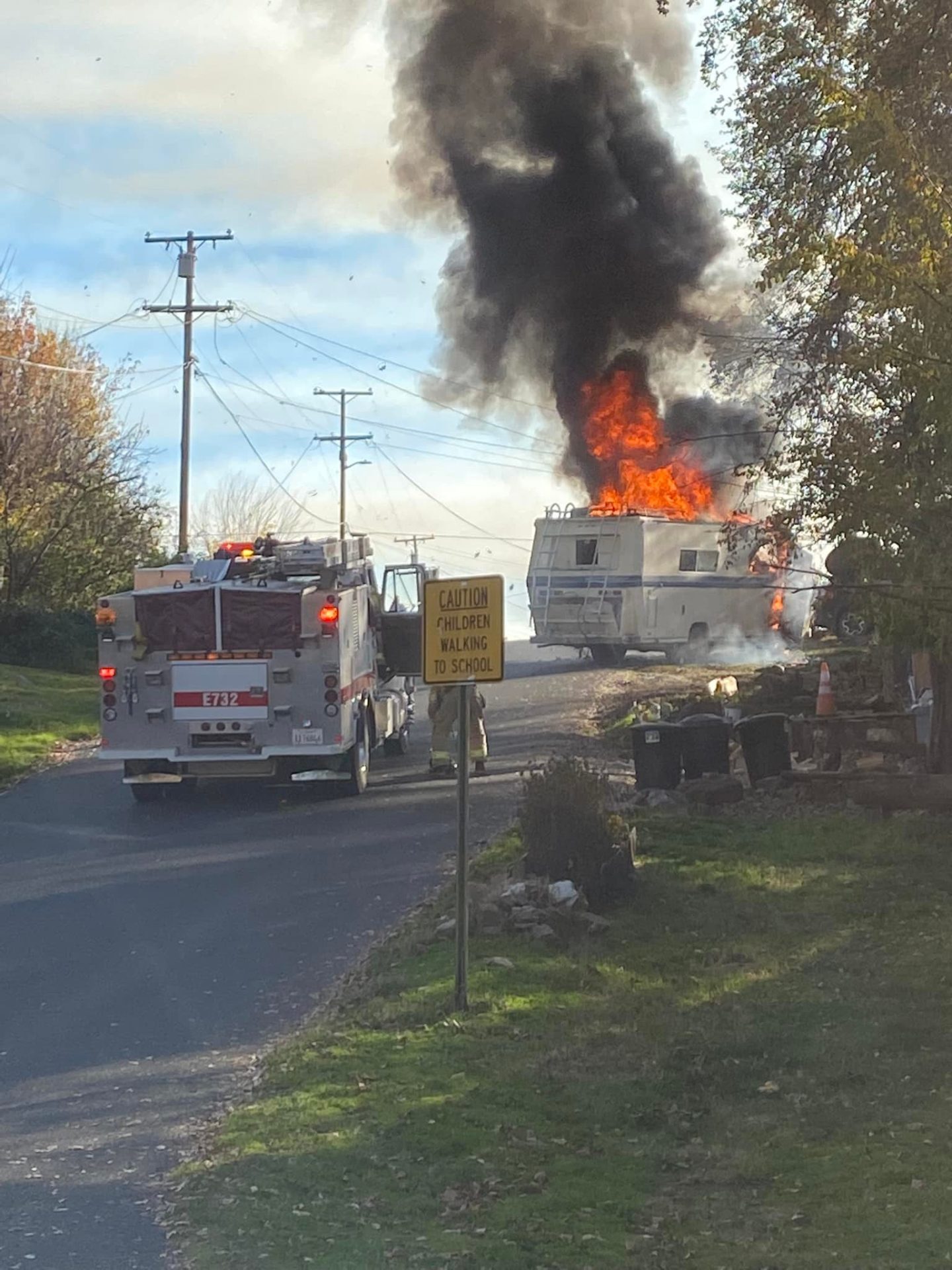 As the image box photo shows flames were shooting out of a motor home this afternoon in Tuolumne. Smoke could be seen billowing into the skies above Oak Street near Elm Avenue and the West Side Memorial Park in Tuolumne just after 2:30 p.m. Firefights found the RV fully engulfed in flames and blocking the roadway. Crews were able to knock down the blaze within minutes.