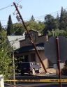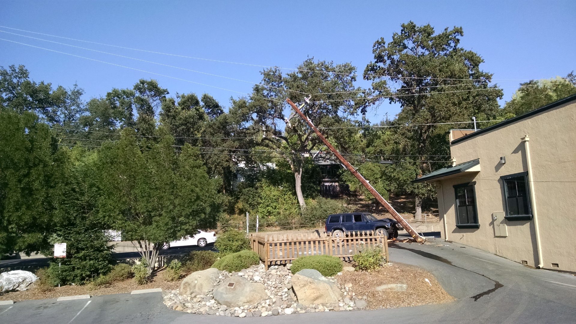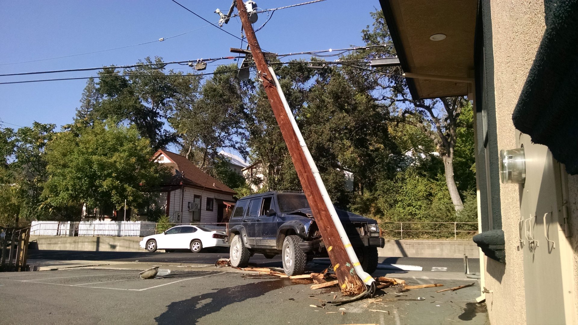 Update 6:30 pm: Sonora Police report emergency crews are not removing the wreckage as the power lines are live.  The pole, which is sheared off at its bottom, remains on the SUV as PG & E crews make their repairs.