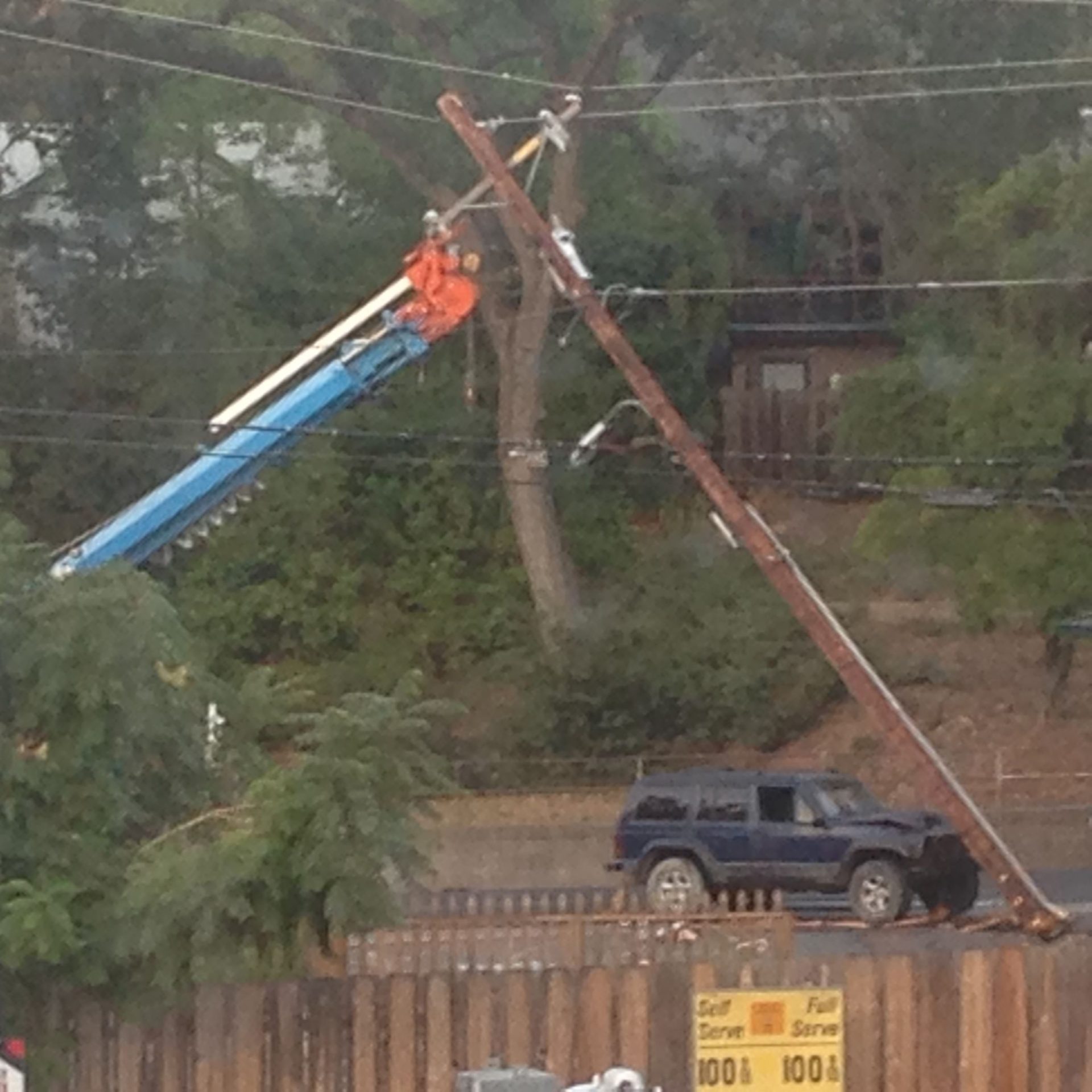 The crash happened at 5:30 pm on Stewart Street near Gold Street leaving 570 customers without power. The pole, which is sheared off at its bottom, remains leaning over the SUV as PG & E crews use a cherry picker to make their repairs.