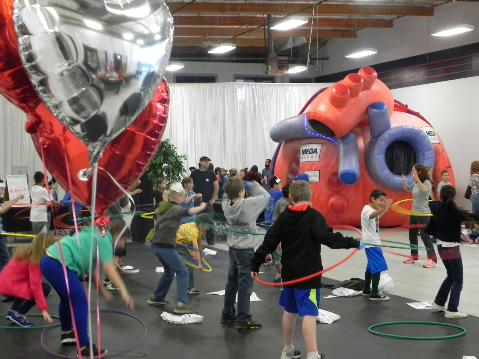Other attractions included interactive stations covering topics like healthy eating and smoking avoidance, with actual examples of nonsmoker and smoker lungs. Among the activities: healthy snack samplings, fitness activities with hula hoops, and coloring sessions of instructional heart health sheets.