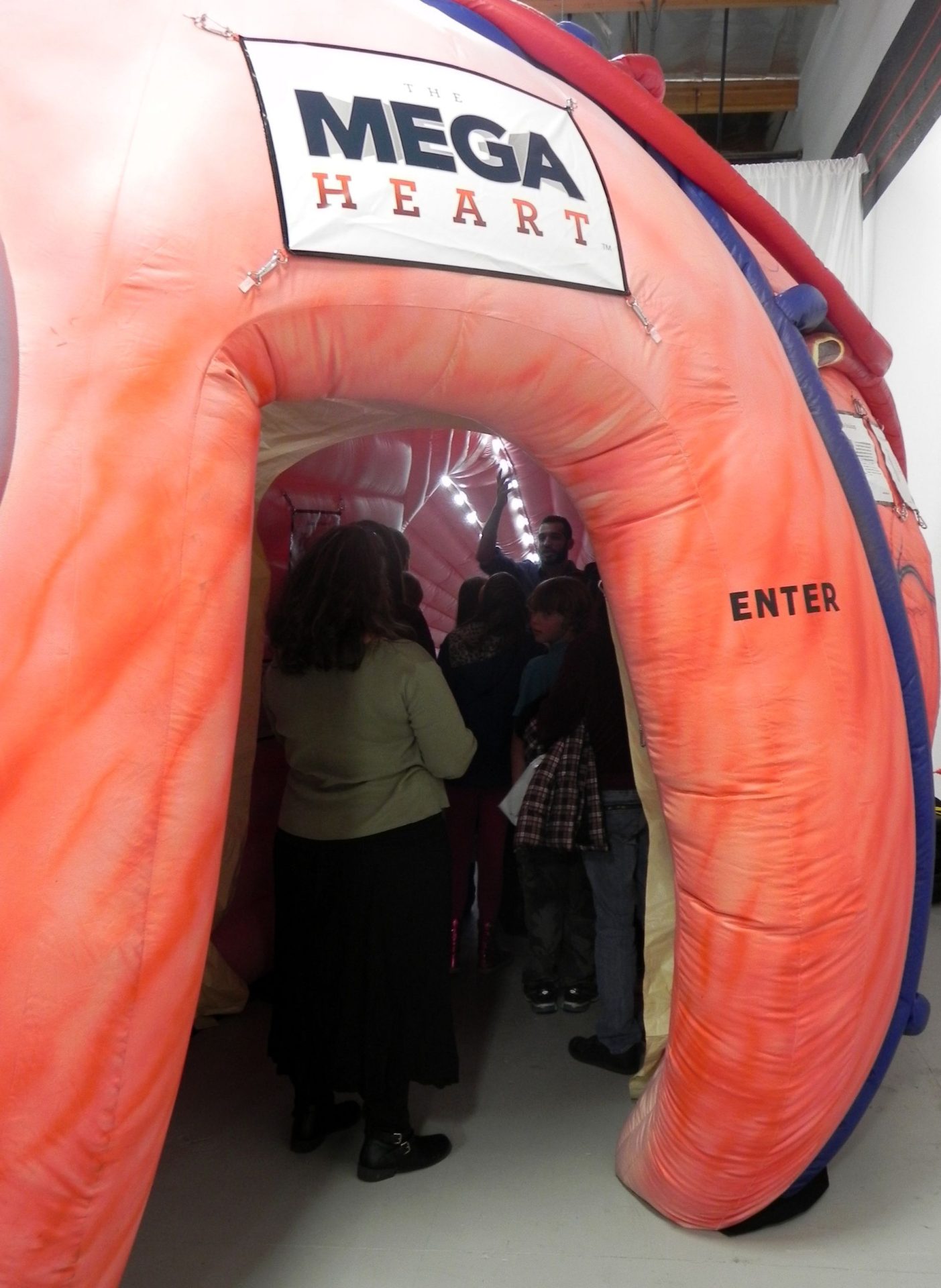 Students from area schools attended in waves from 9 a.m. until 1:30 p.m. Beckoning from across the room, the gently pulsing, super-sized inflatable LED-lit walk-though Mega Heart exhibit was main draw for many of the kids. An impressive 25 feet wide by 16 feet high by 13 feet wide, Lindsay Brewer, SRMC marketing director explains, “You can go through different areas of it and see different cardiovascular disease, different blood flows…it’s pretty impressive and [for] the kids, that’s their favorite part.”