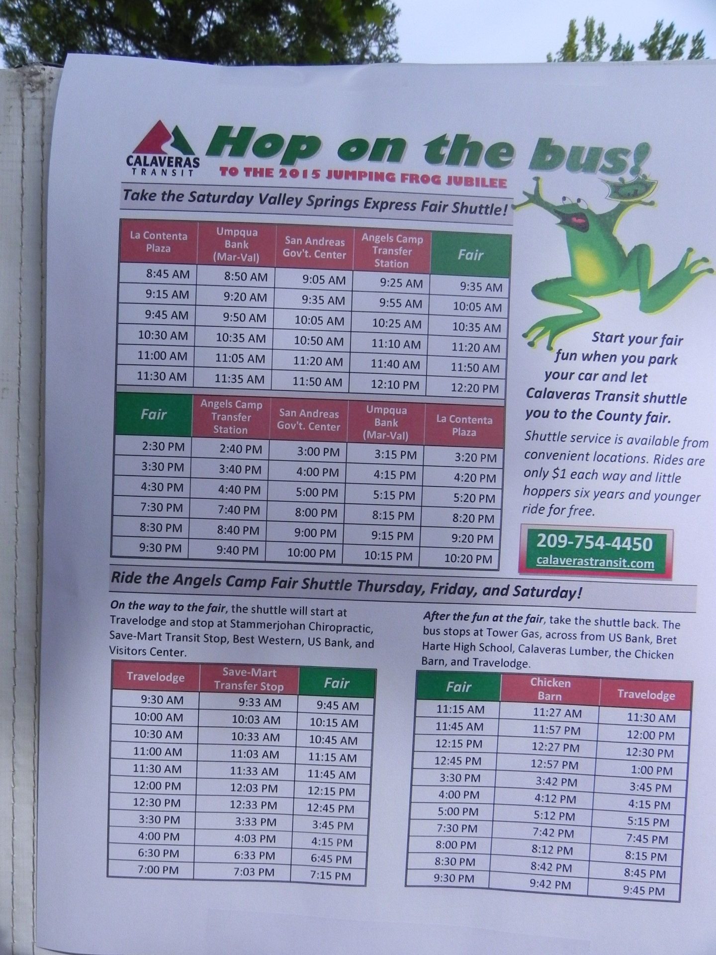 Calaveras Transit District is offering one-dollar bus rides to the fair from various locations in Angels Camp today through Saturday, when it will additionally make pick ups and drop offs at points in Valley Springs and San Andreas; no rides will be offered Sunday. For more details, click here.
