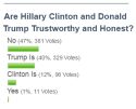 A recent informal myMotherLode poll asked the question “Are Hillary Clinton and Donald Trump Trustworthy and Honest? The top result was ‘No’ with 47 percent of the votes. Another 40 percent said Trump alone is Trustworthy and Honest, while 12 percent said only Clinton is. One percent said that both the Democratic and Republican presidential candidates are Honest and Trustworthy.