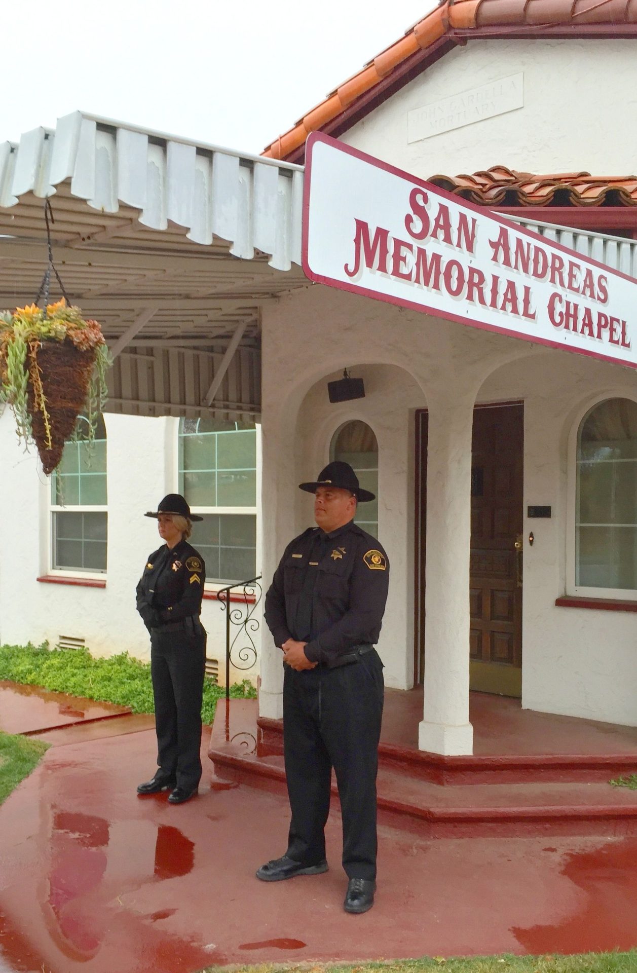 San Andreas, CA — As the Mother Lode received its first significant fall rains Monday morning, a Calaveras County Deputies Honor Guard stood watch over the unit’s fallen commander at San Andreas Memorial Chapel.