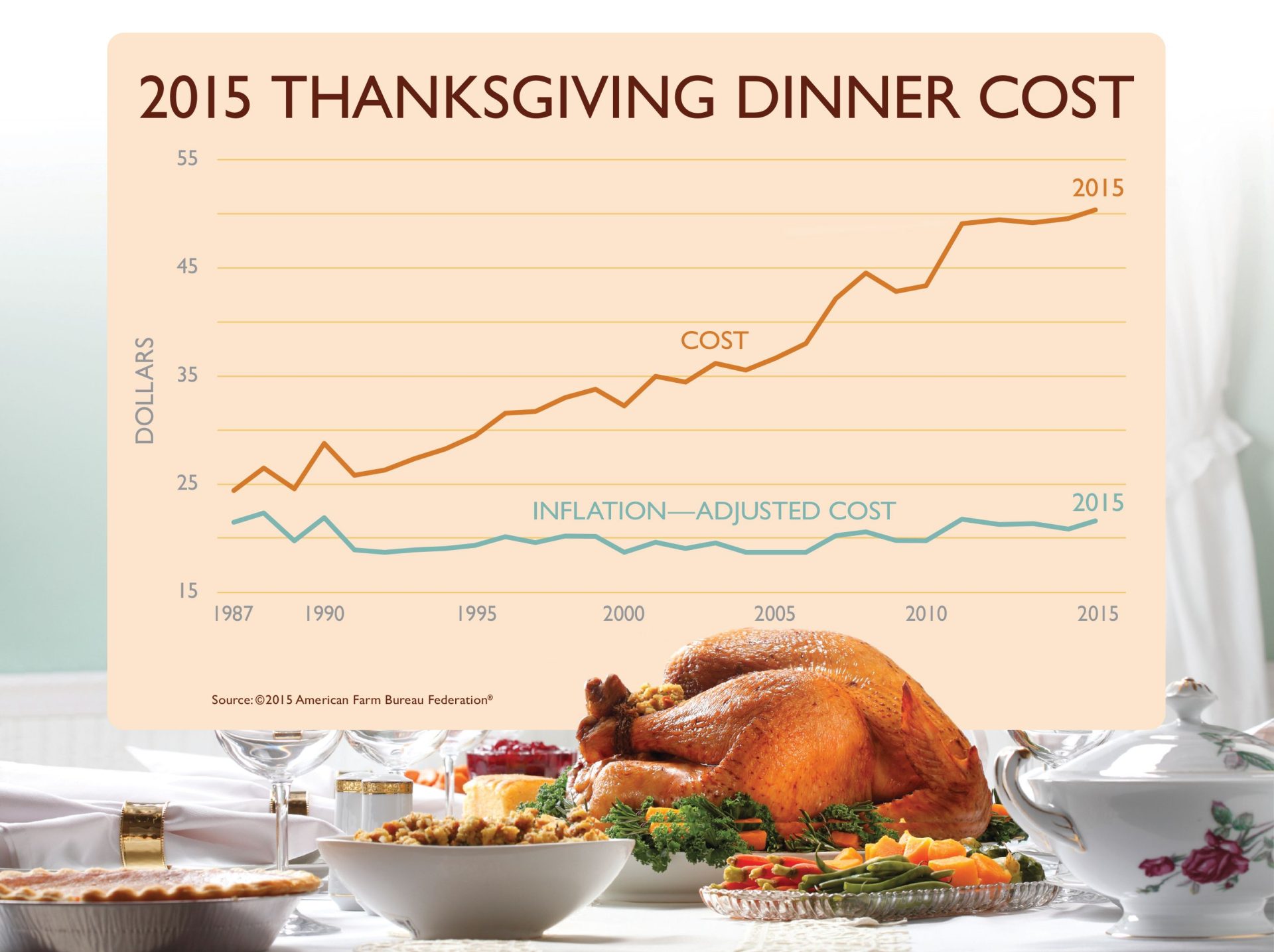 In 2015 the American Farm Bureau Federation’s informal Thanksgiving dinner cost survey found the price is up again and over $50 for the first time. The survey found average cost of this year’s feast for 10 is $50.11, a 70-cent increase from last year’s average of $49.41, and up $1.07 from 2013.