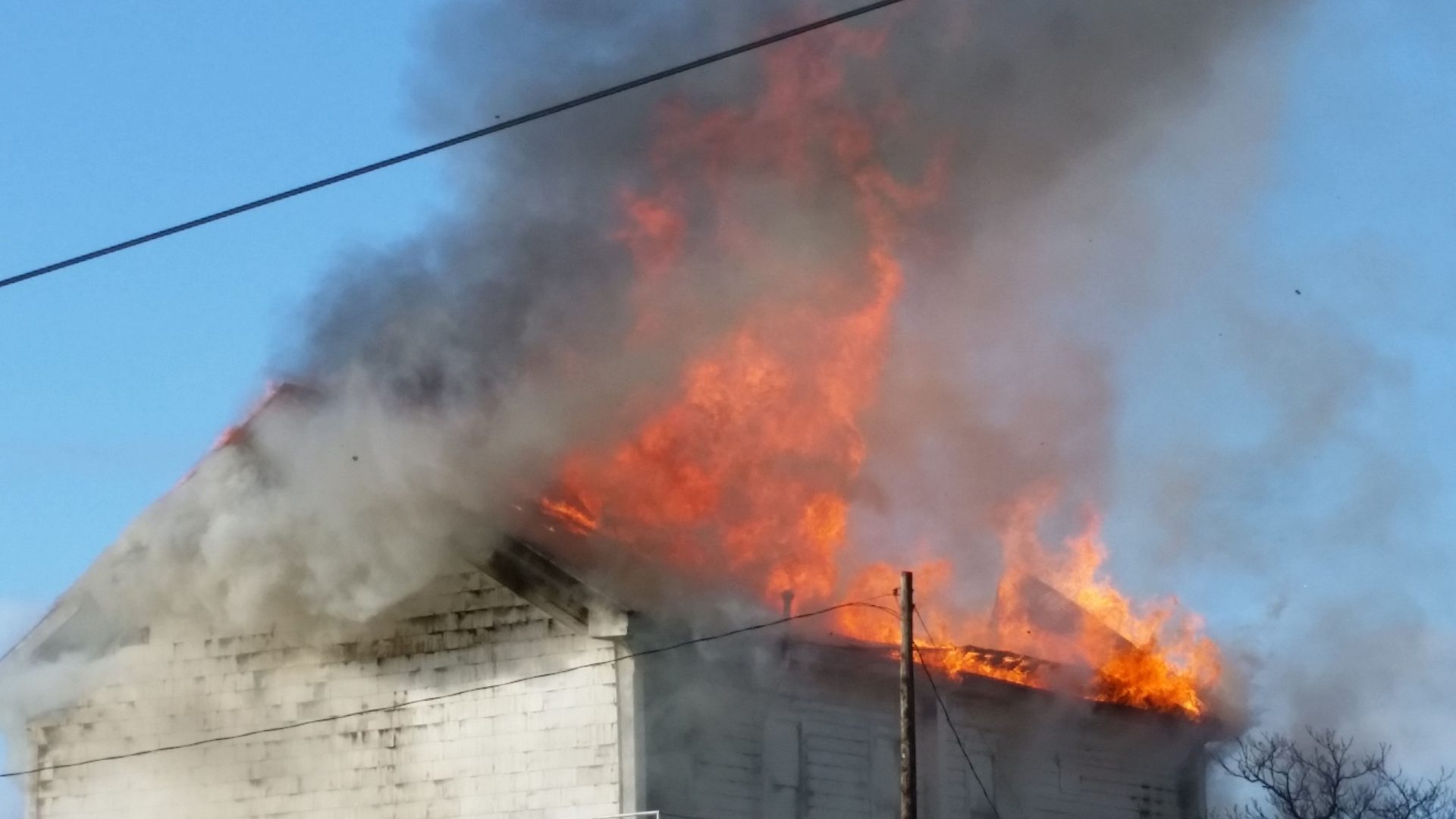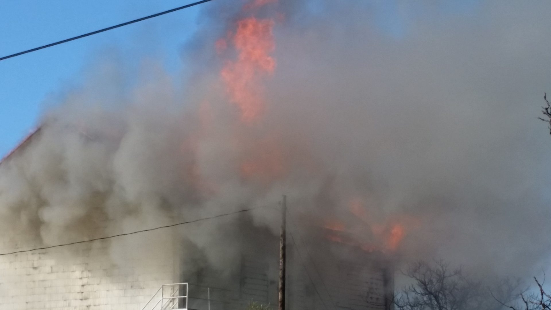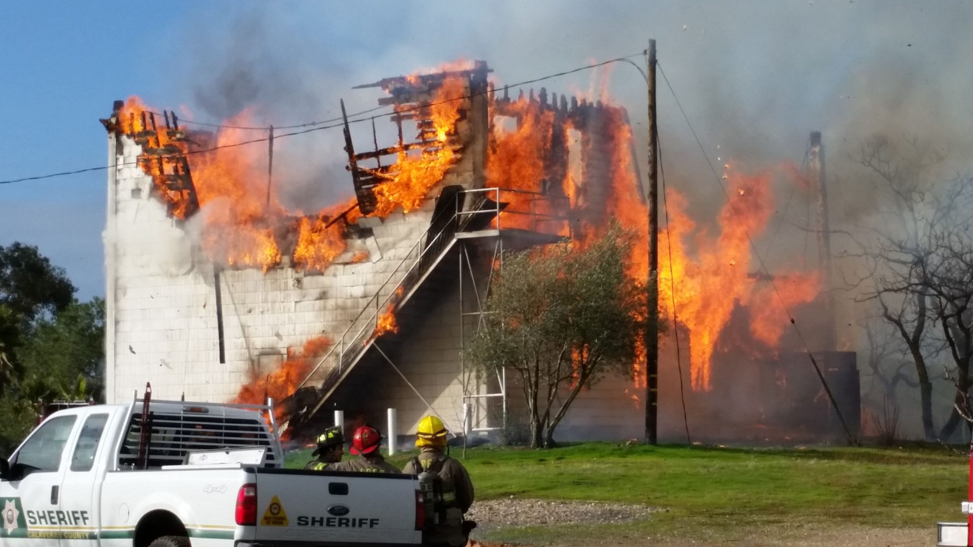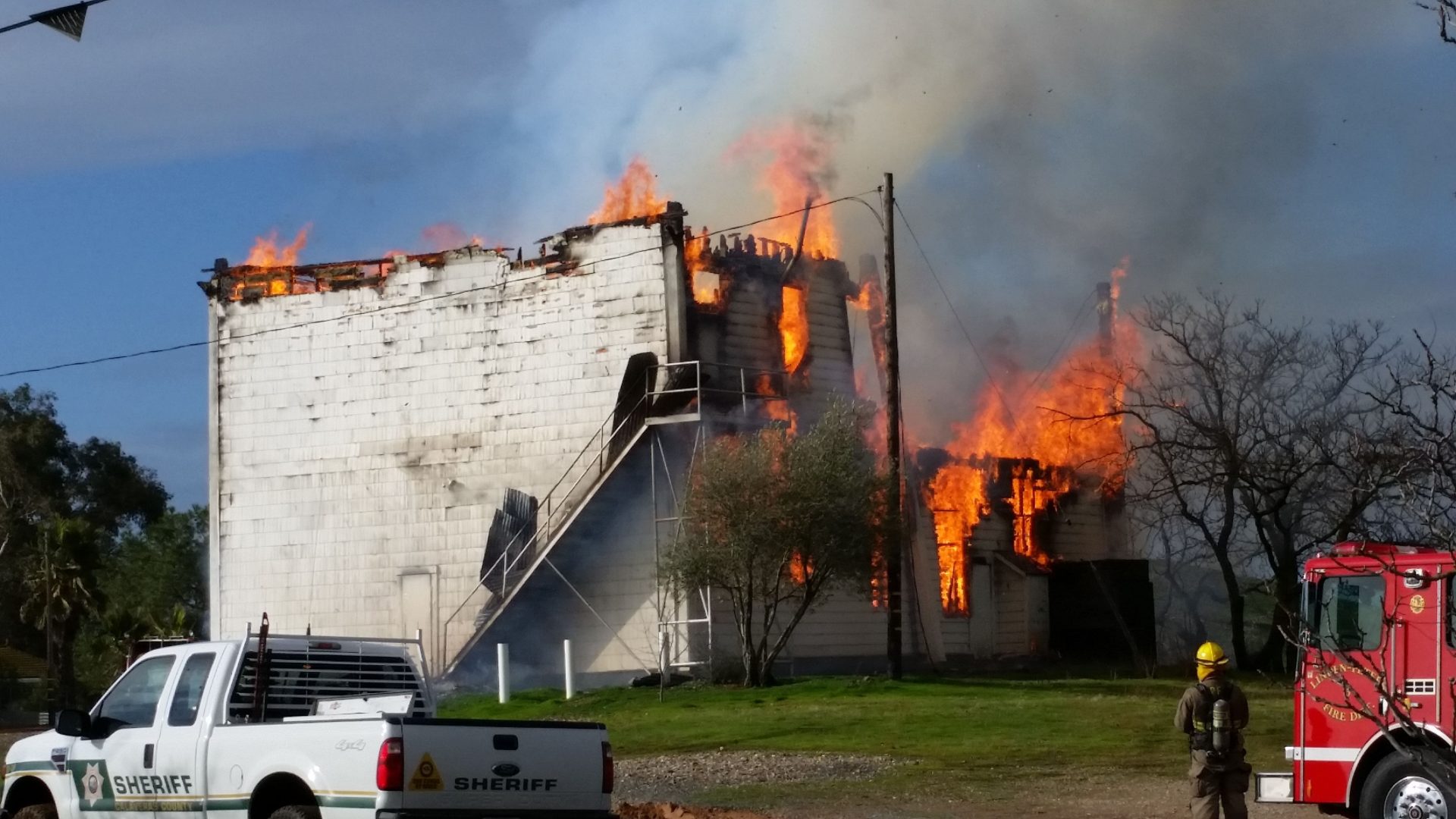 Update at 10:50 p.m.:Â Cal Fire dispatch reports the flames have engulfed nearly 3/4 of the Masonic Hall as firefighters continue to battle the blaze.