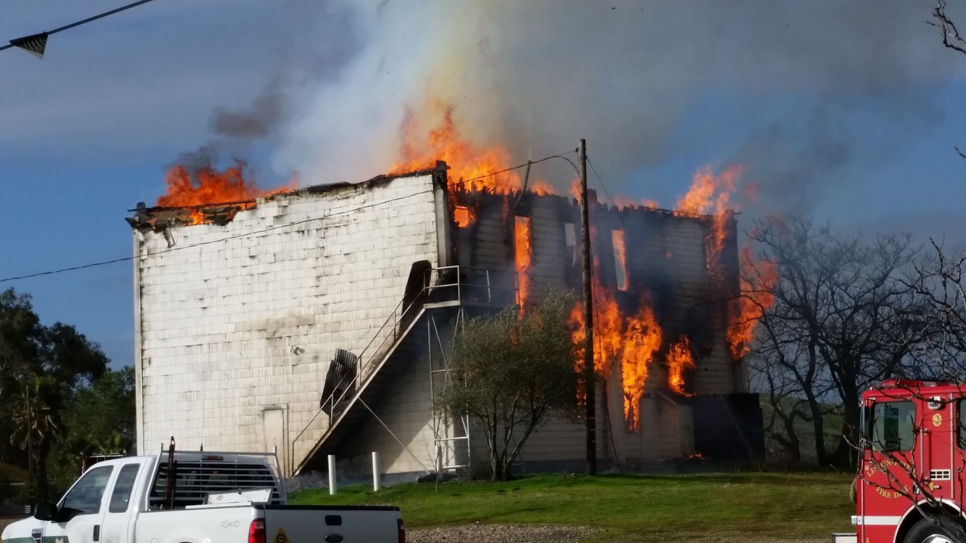 Update at 11:40 p.m.:Â Cal Fire dispatch reports the fire has been contained with much of the building destroyed. Fire investigators are on scene, but there is no word on what sparked the blaze or whether it is the building ignited over suspicious circumstances. Luckily, there are no injuries to report and the flames did not spread to any nearby buildings or vegetation.
