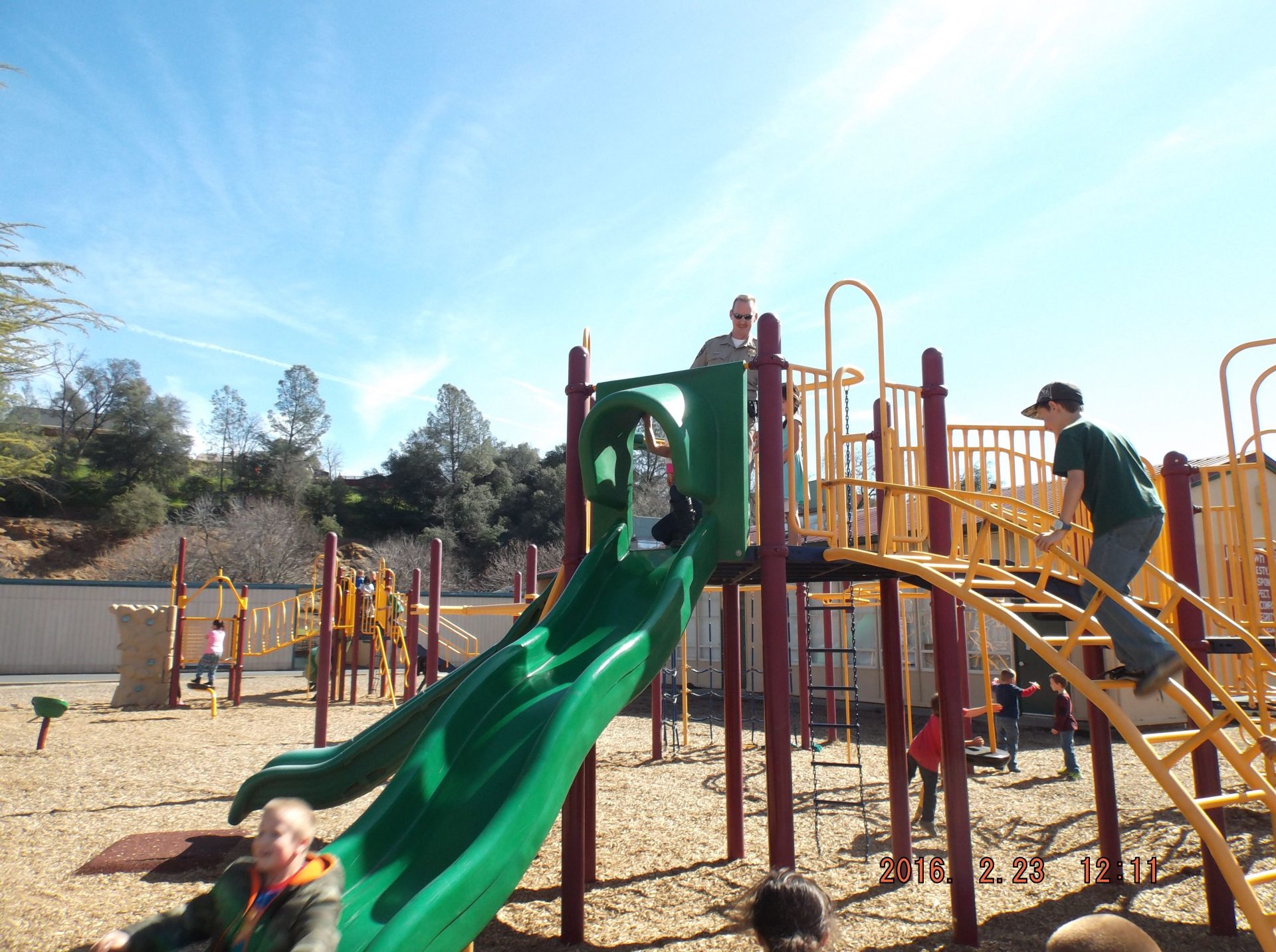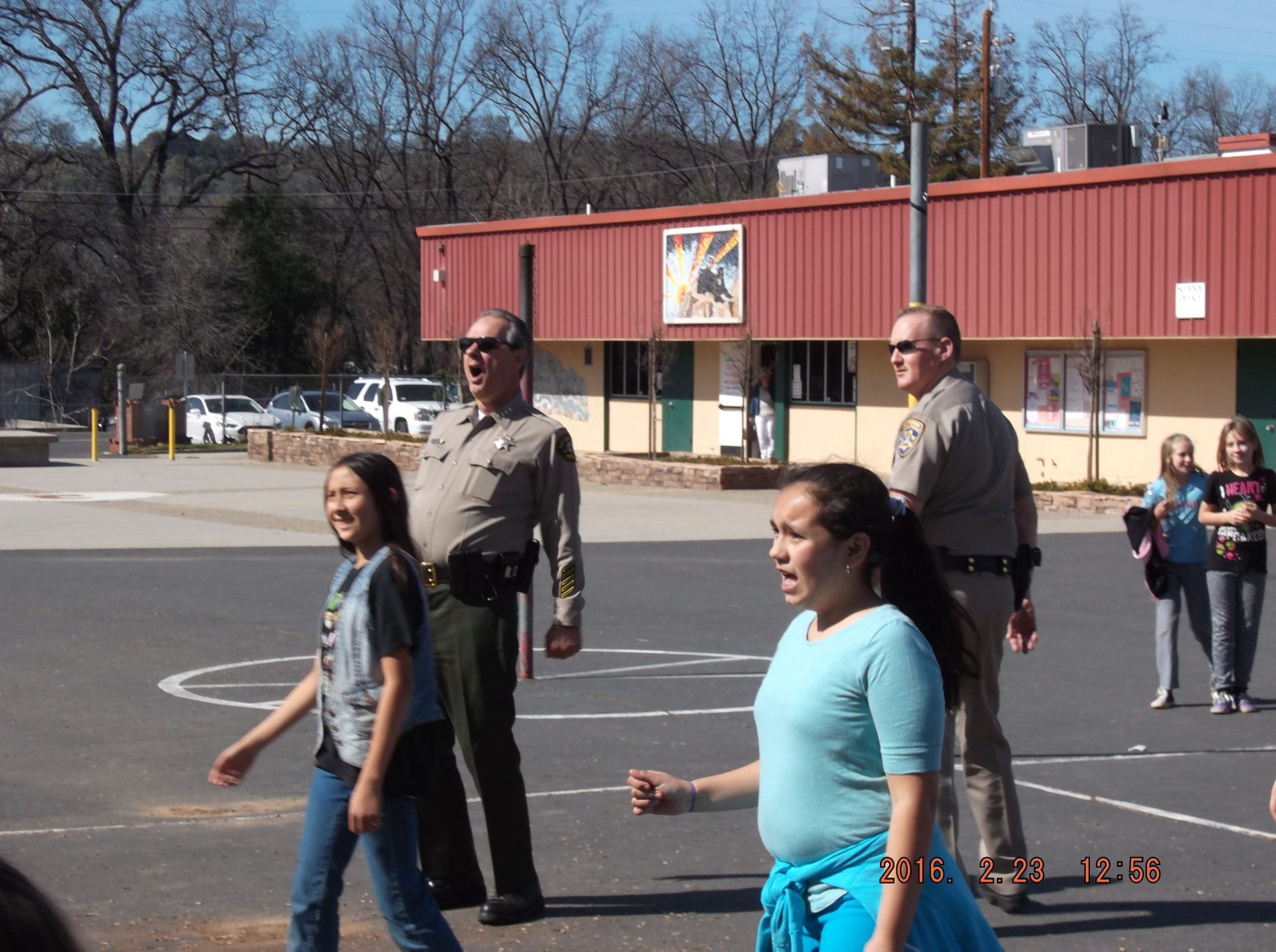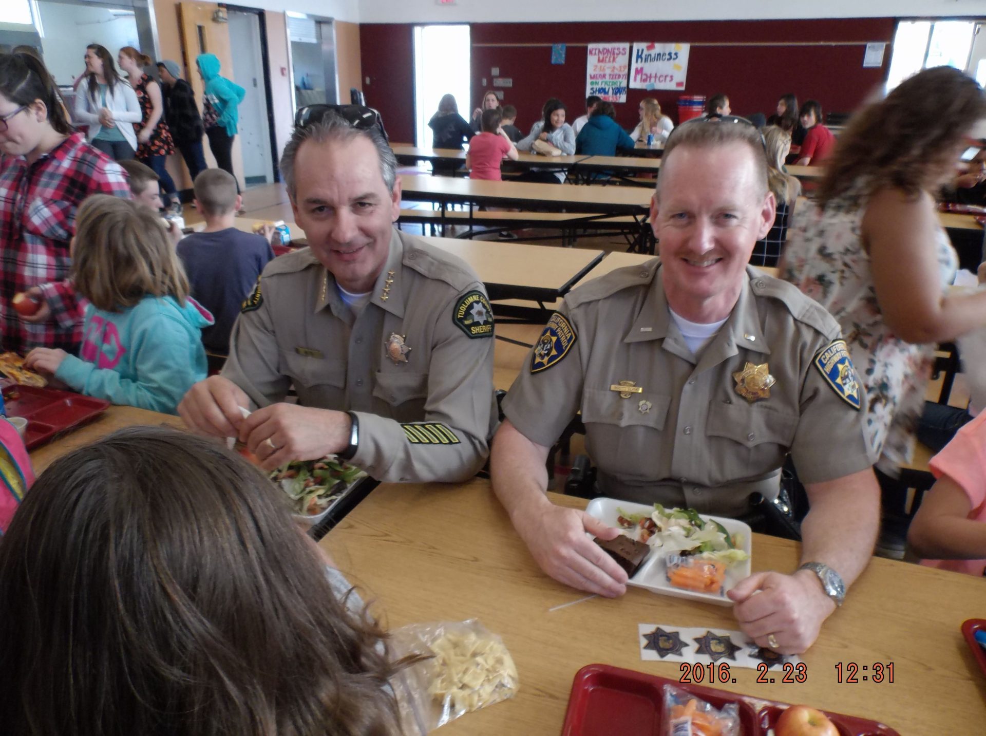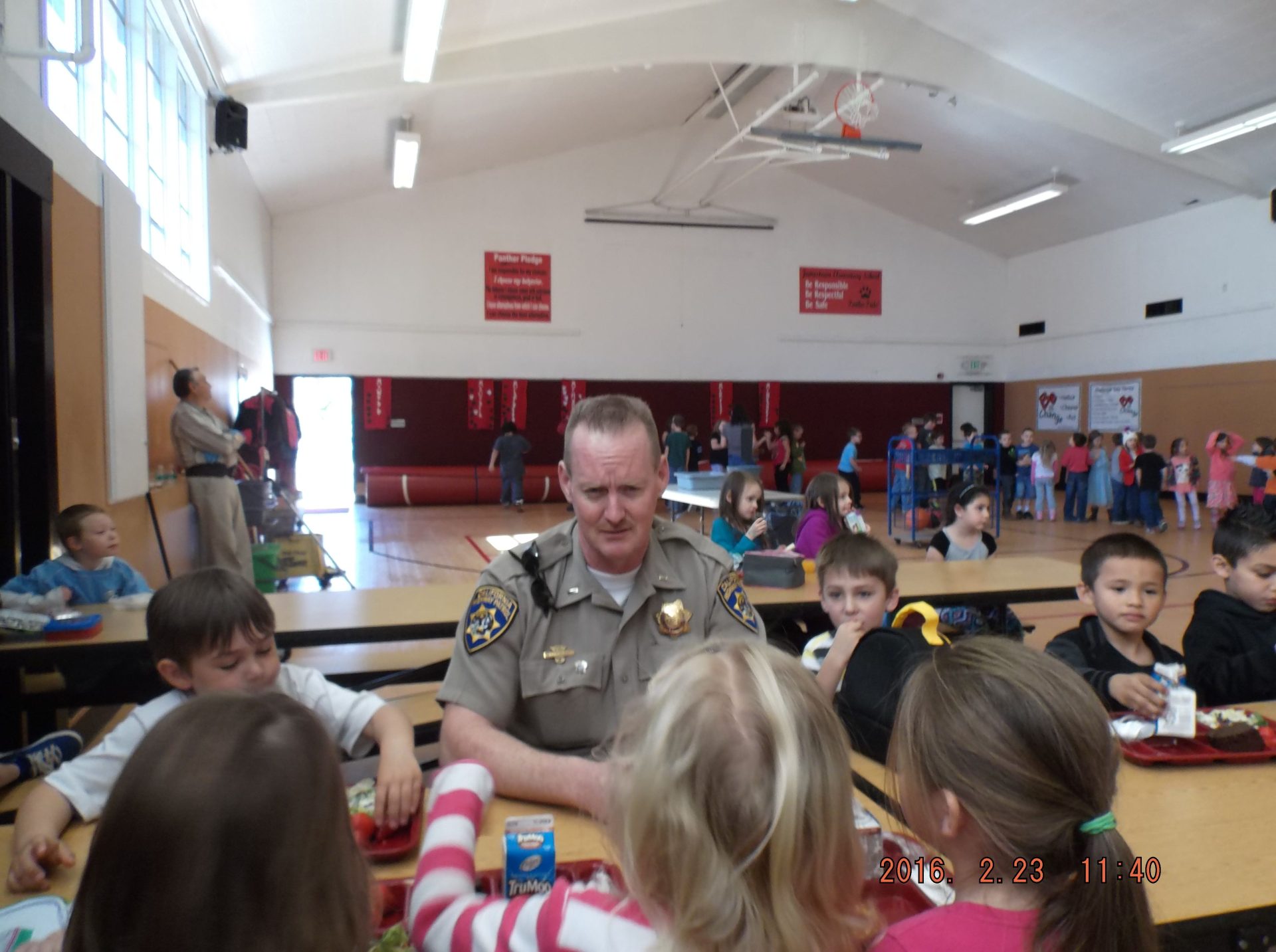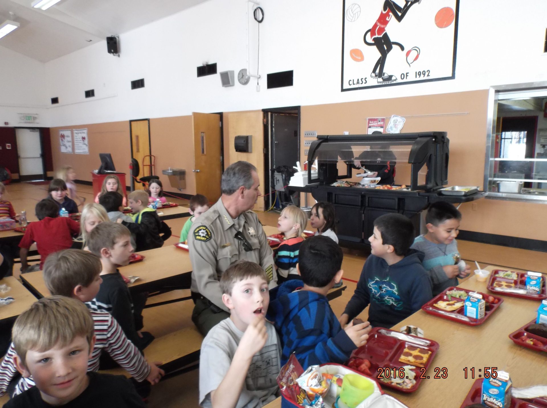 Students from kindergarten to eighth graders sat down to lunch with Sonora Unit CHP Lt. Scott Clamp and Tuolumne County Sheriff Jim Mele. The questions ranged from, ‘What’s all that stuff on your belt, to why do you carry a gun?” according to CHP spokesperson Nick Norton, who states the reason for the visit, “It’s the trust part of it, to get them to trust us. Sometimes we can appear to be intimidating when we’re in uniform. This gives us a chance to maybe bring down that wall…and let them get to know us, to know that we are here to help them.”