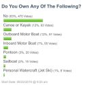 An impressive 37% of MyMotherLode voters in an informal poll reported having boats and/or recreation vehicles. A canoe or kayak was most popular with 12% of 752 votes. A boat with an outboard motor also got aproximately 12% of the votes, just two less than those who have a canoe or kayak. A boat with an inboard motor only got 7%, pontoon received 3%, sailboat 2% and personal watercraft (Jet Ski) got just 1% or 8 votes.