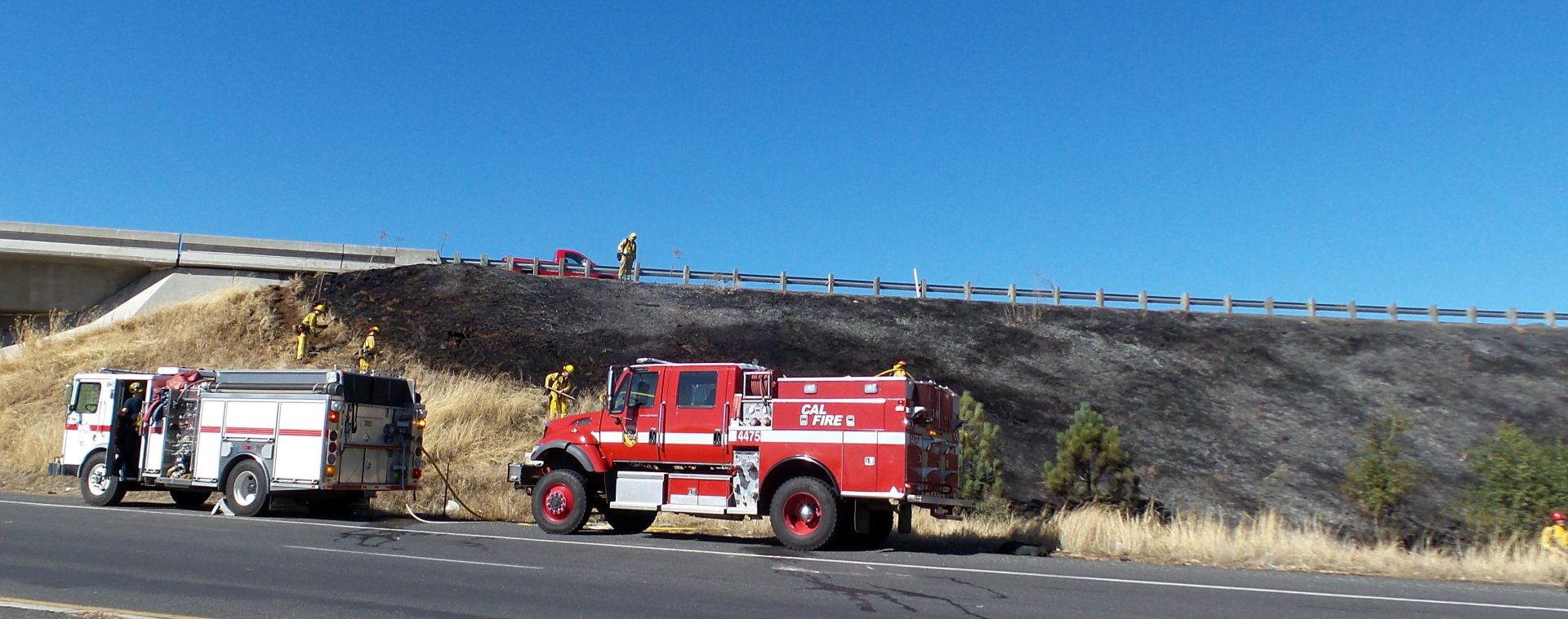 Update at 2:35 p.m.: Cal Fire reports crews have contained a 100 x 100 foot fire along Highway 108.  The flames broke out just after 2 p.m. Crews arrived on the scene to find the flames burning in a median along the highway on ramp at the Mono Way intersection near Sonora Ford. The flames were put out within minutes. No structures were threatened. What sparked the blaze is under investigation, according to Cal Fire.