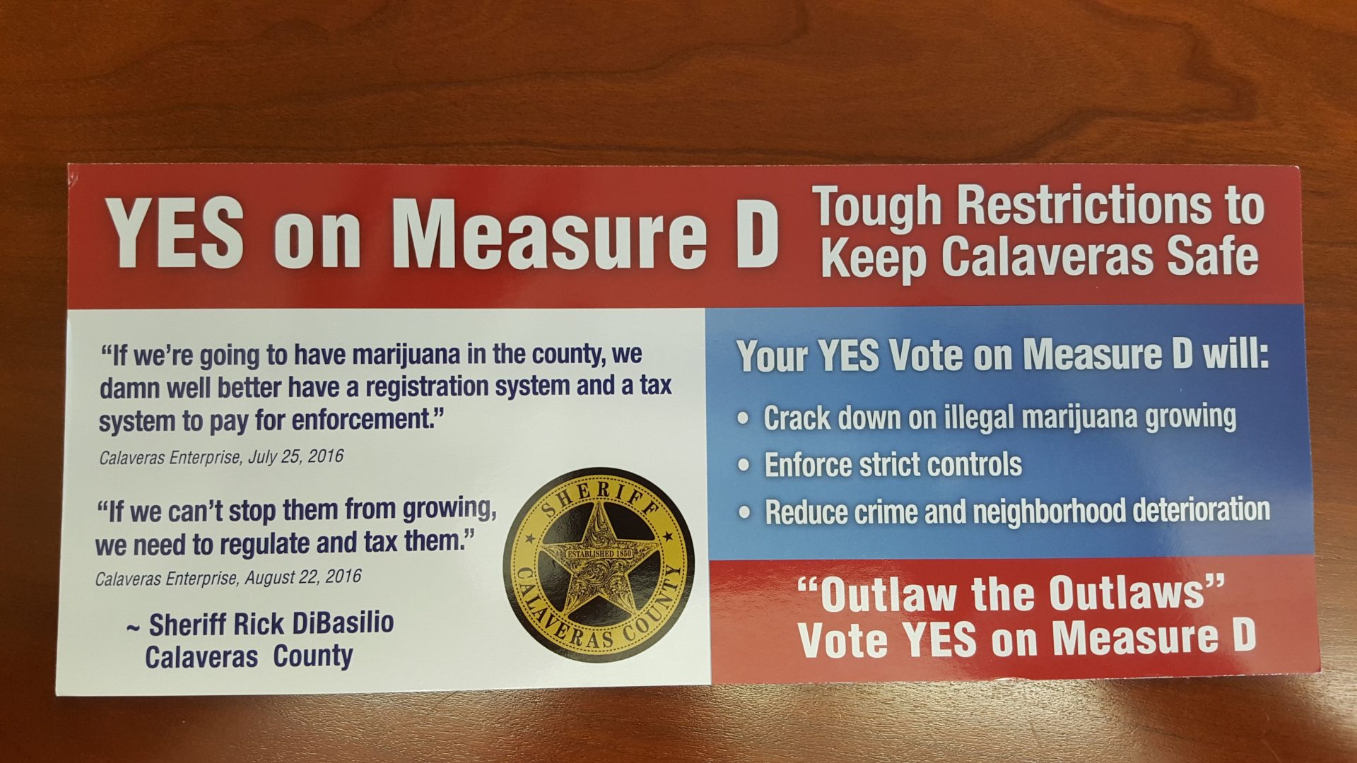 Organizers of the citizen-proposed Measure D Cannabis Regulation on the Calaveras ballot are using the sheriff’s star logo next to broad comments he made months ago regarding the general regulation of the medical marijuana industry. According to the sheriff, the quotes are used out of context.