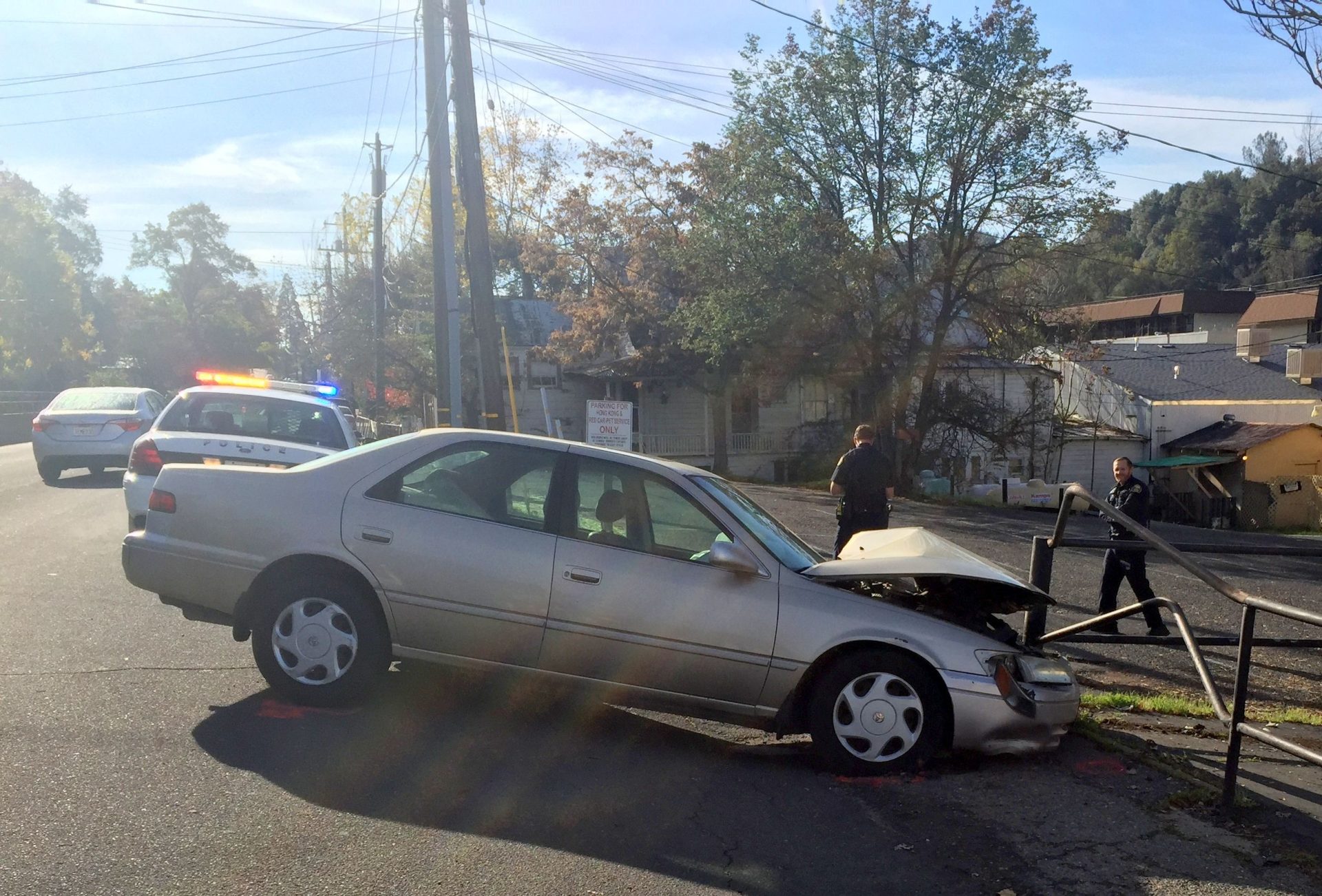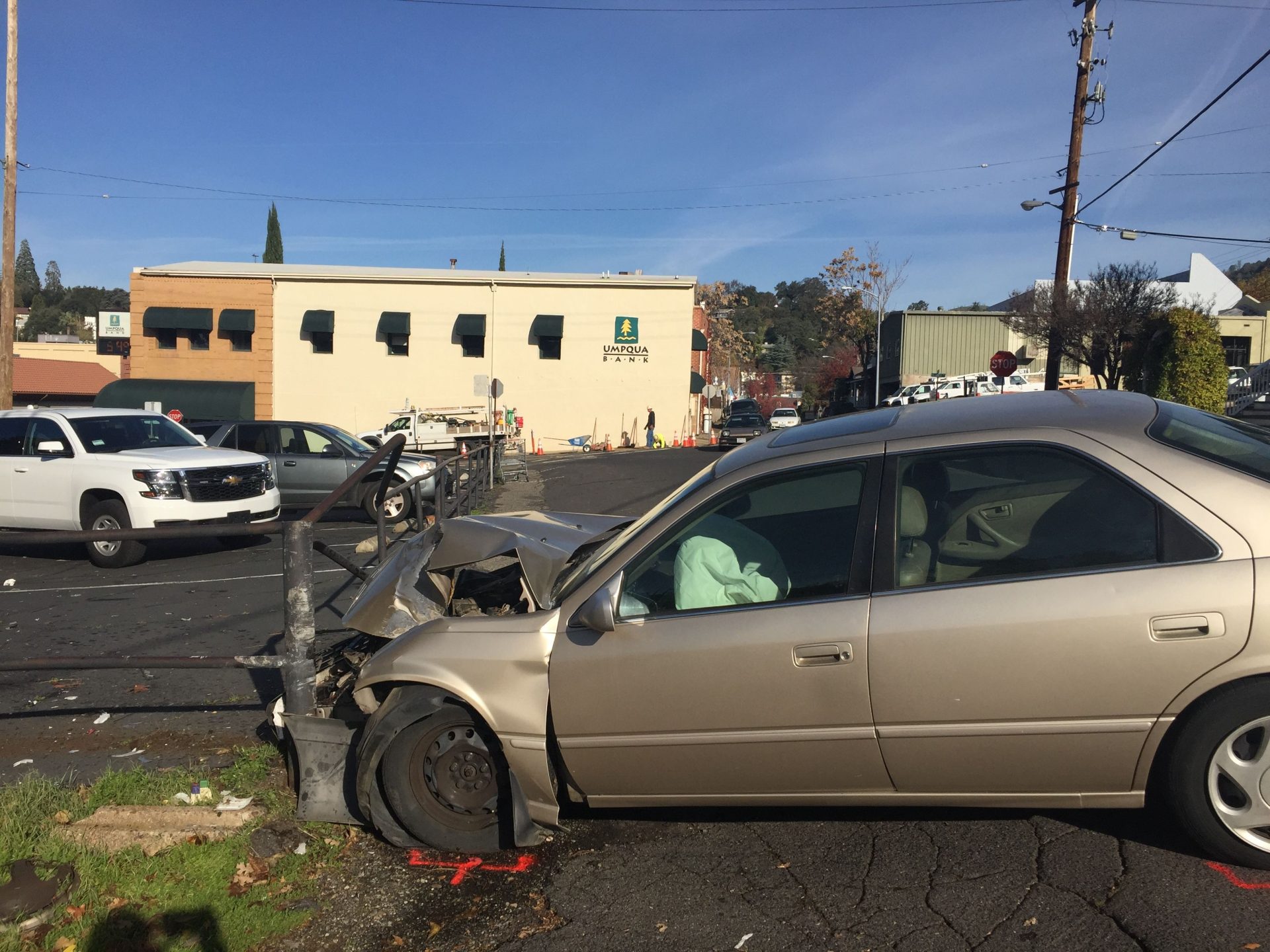 Sonora, CA — A single vehicle accident has damaged property in downtown Sonora. The incident happened at about 9:30AM on Stewart Street. The car crossed oncoming traffic near the Church intersection and significantly damaged the metal railing around the 913 South Stewart Street parking lot.
