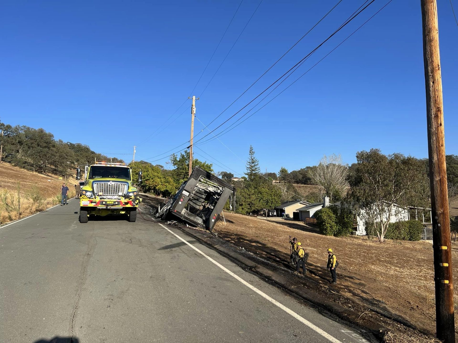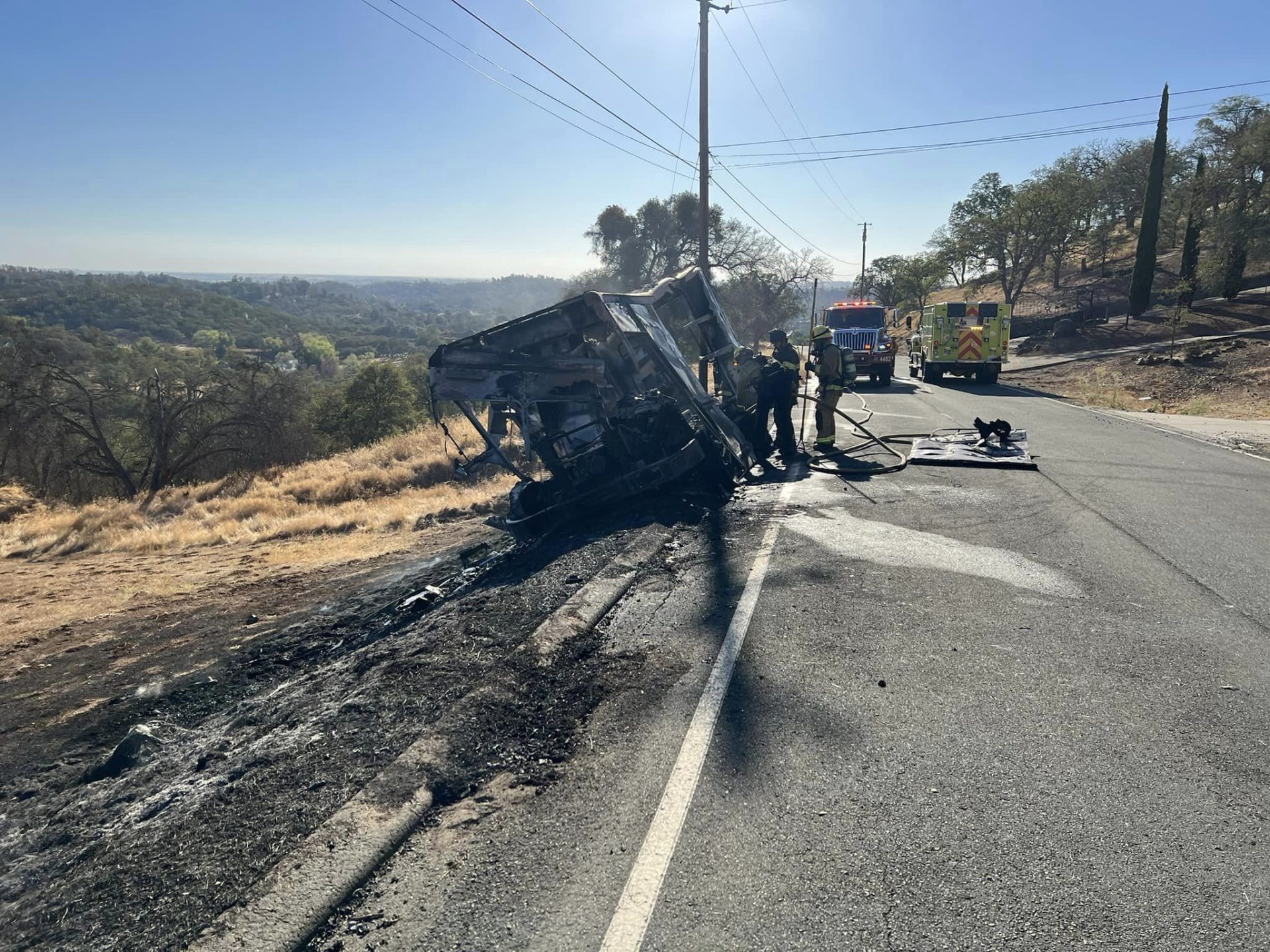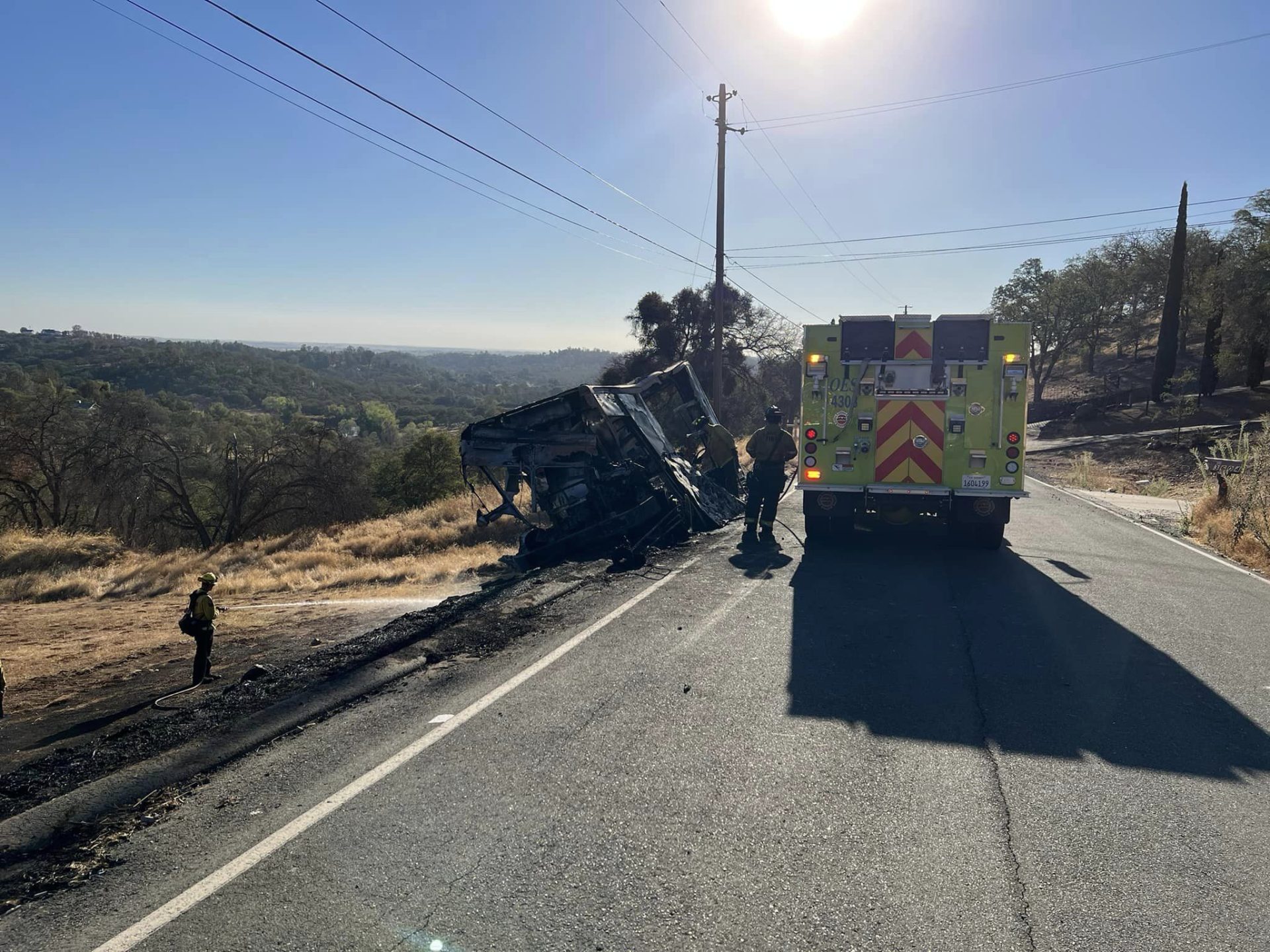 Update at 5:25 p.m.: Ground crews have stopped the forward rate of spread of a vehicle fire that extended into nearby vegetation. The Hart Fire ignited in some grass on Hanley Drive, south of Highway 26, near Hart Vickson Lane. CAL Fire spokesperson Emily Kilgore reports the fire remains a quarter-acre in size. The CHP reports that it was a UPS truck engulfed in flames. There were reports of explosions inside the truck. No structures were threatened. Crews will continue working on containment, with mop-up to follow.