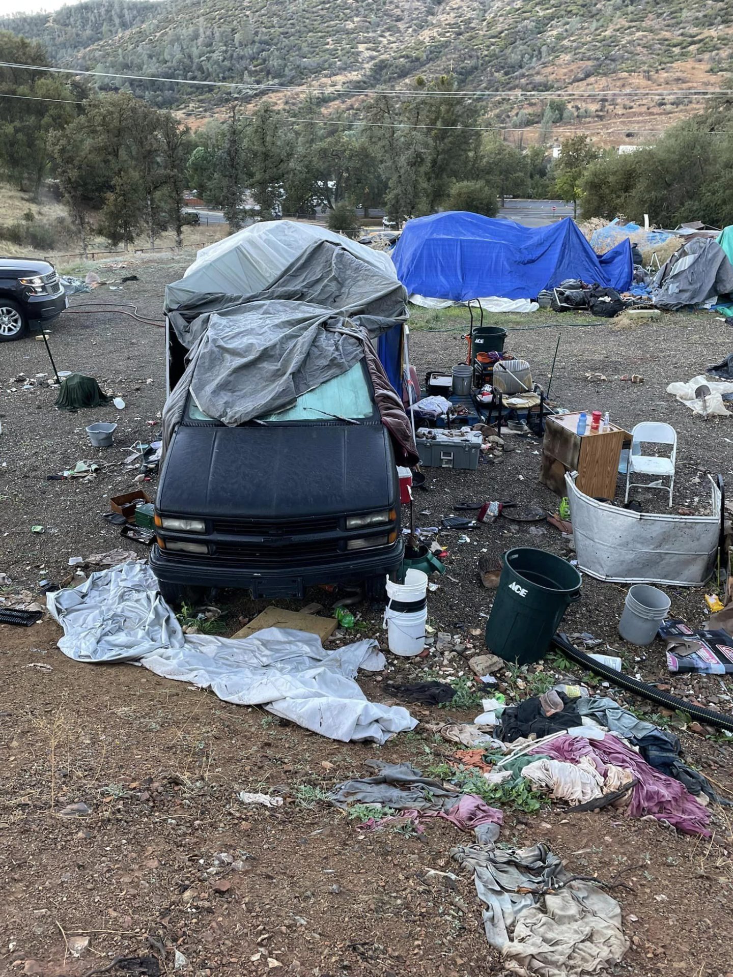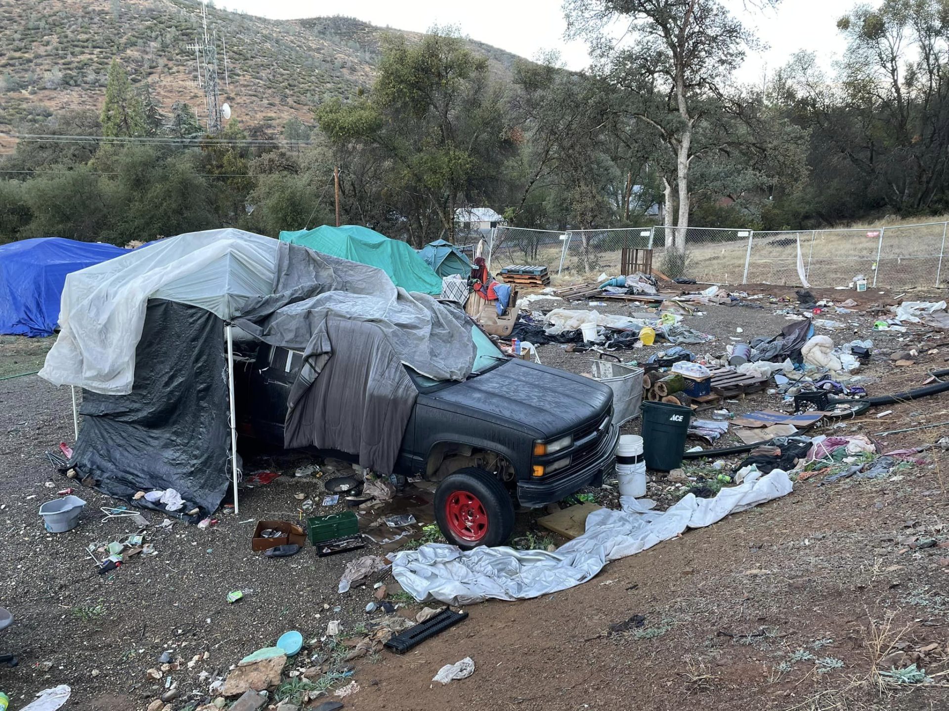 Mariposa Sheriff’s Office narcotics investigators served a warrant Tuesday on a makeshift residence consisting of a broken-down vehicle covered in tarps on Frank Wilson Way off Highway 49 in Mariposa, as pictured in the image box. Deputies uncovered 157.5 grams in total.