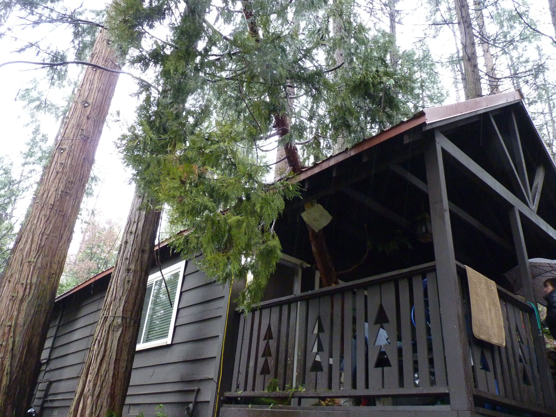 Lauralee Brown, a local homeowner of a wooded property near Twain Harte, shares how one of her tenants called her after, literally, experiencing a close shave this past Friday morning, compliments of a cedar tree. Brown describes her property on South Fork Road as located about a mile and a half from the Twain Harte post office, heading towards Brentwood Lake. Recounting heading out there to check out the damage. “What I saw was…the top where about a half of a cedar tree that had flown off…pierced the roof of my cottage – I have a main house and a cottage — it came straight through.”