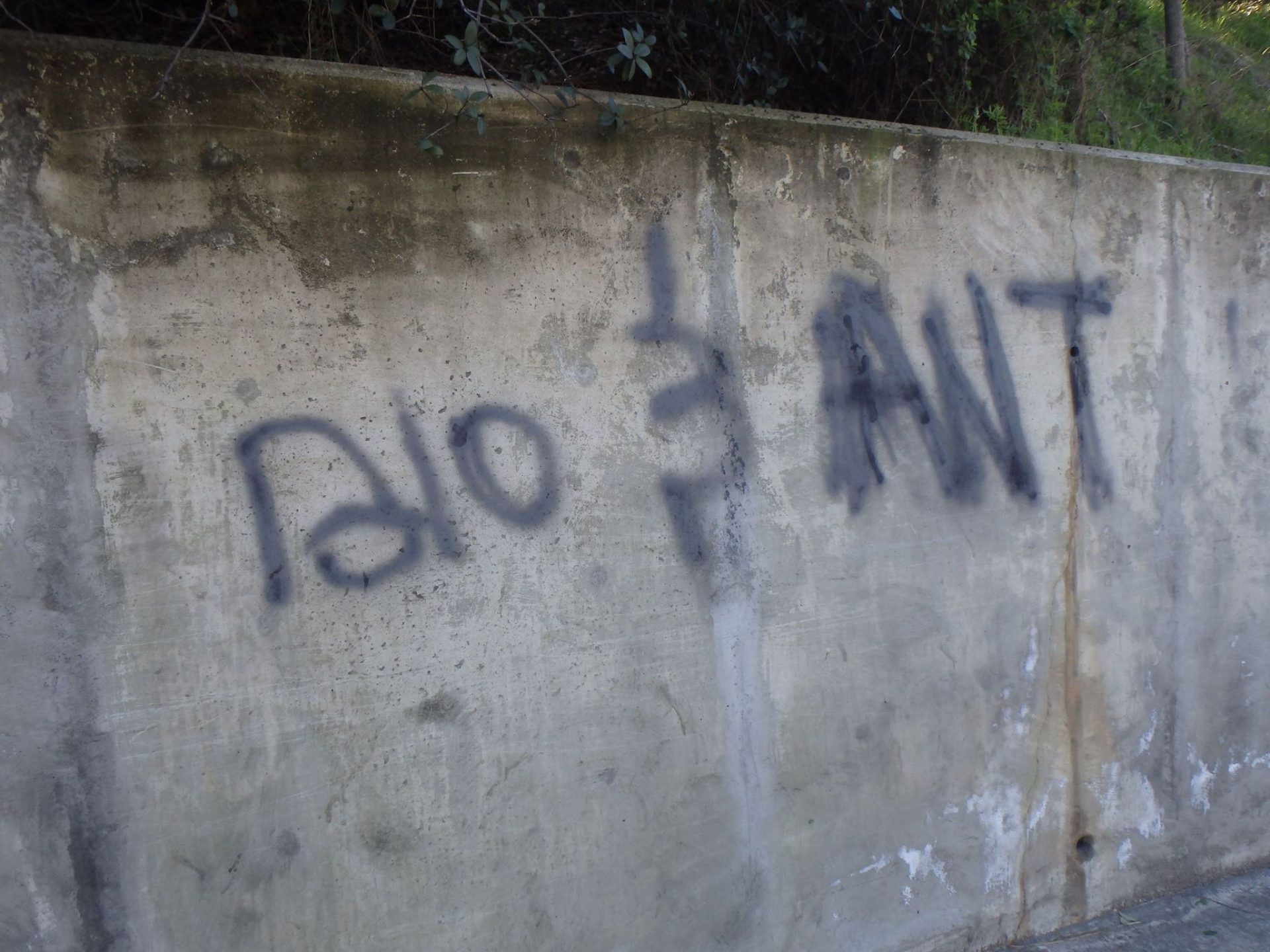 Police were alerted to the vandalism Sunday, which included a swastika along with the number “1210” and the word “Ant” painted on the wall between the Hospital Road and Sanguinetti Road intersections.