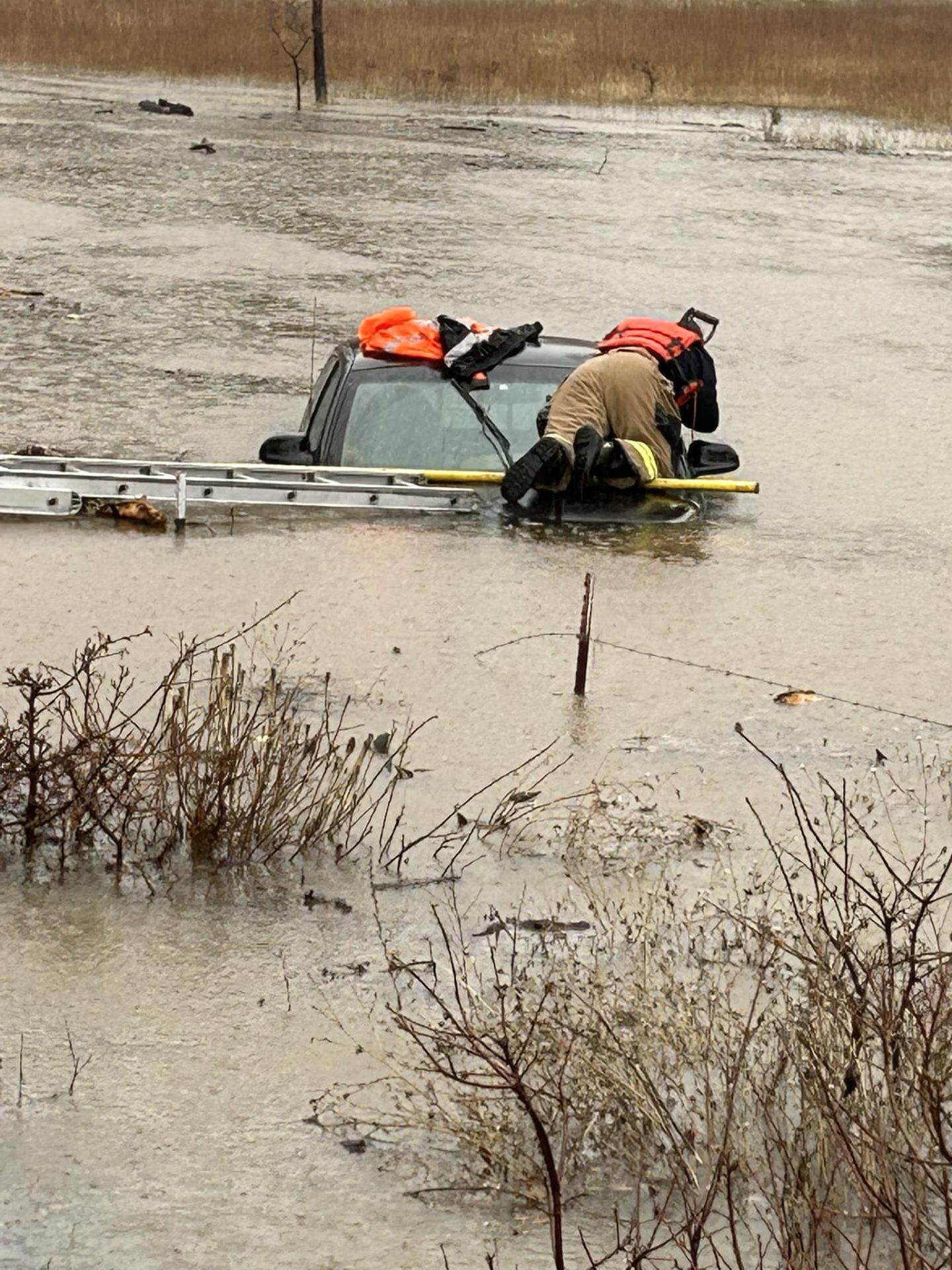 Rescue crews work on truck found in flooded area off Rail Road Flat Road