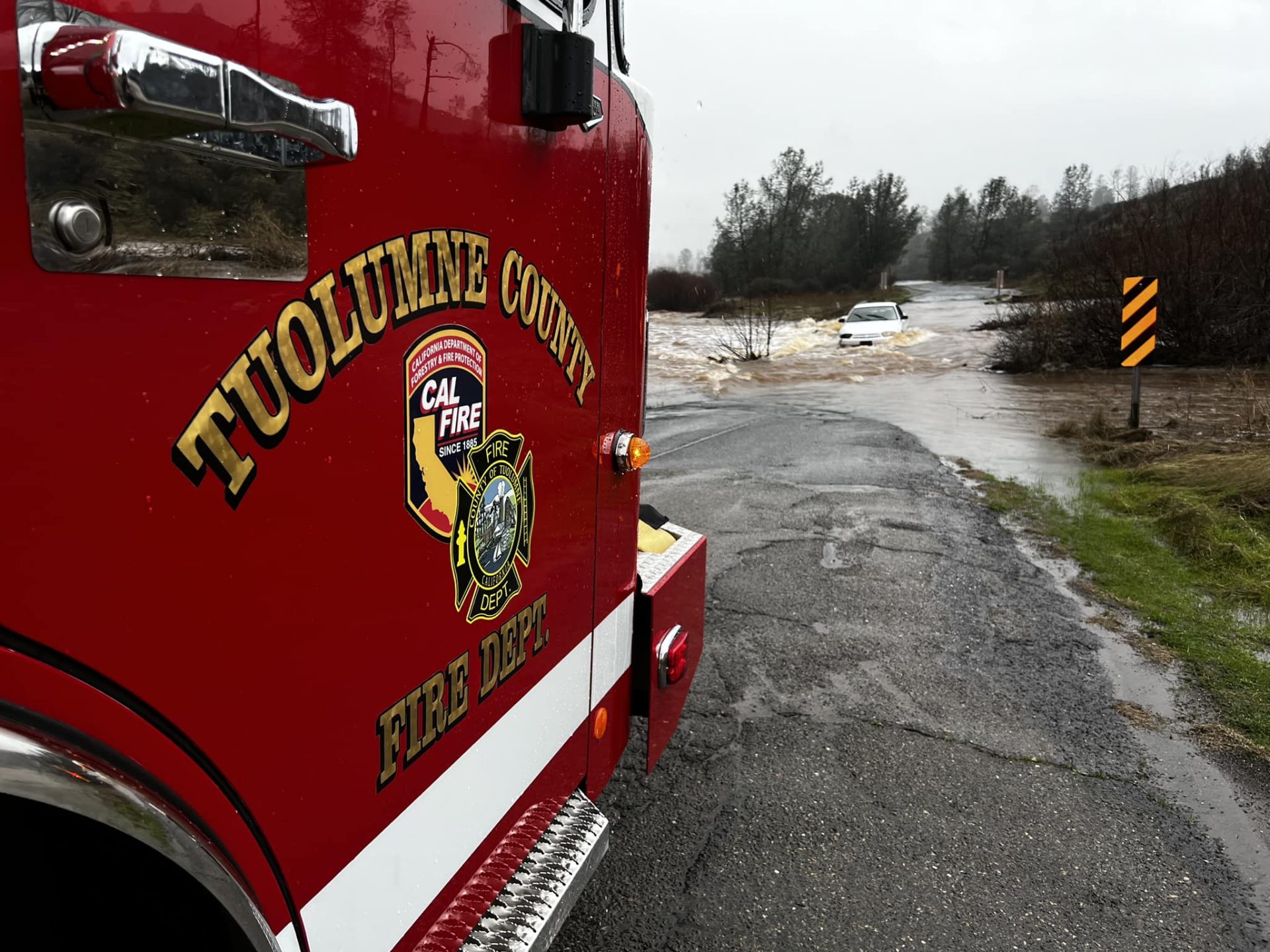 Original story posted at 7:41am: Tuolumne County, CA — The CHP reports that a white sedan has gotten stuck on a one-lane flooded bridge on Red Hills Road near Sims Road outside of Chinese Camp.