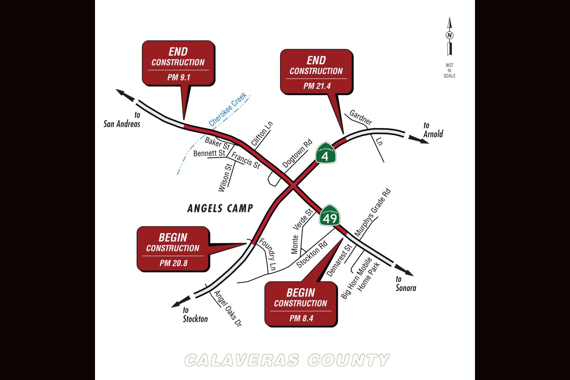 Caltrans will hold an in-person public meeting for the project tomorrow (Wed., Feb. 8) at the Bret Harte Union High School Multipurpose Room at 323 South Main Street in Angels Camp from 6 p.m. to 7:30 p.m. Caltrans proposes to make intersection, roadway, pedestrian, and bicycle improvements and modify the intersection with either “a roundabout or signalized intersection.” The latter is also being proposed for the Highway 49 and Francis Street intersection just north.