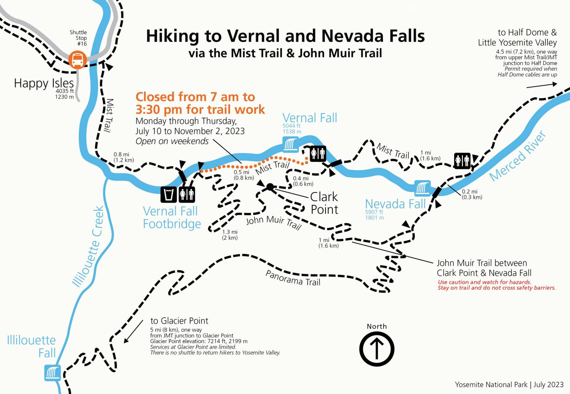 Starting from July 10, a specific segment of the Mist Trail, known as the stair section, will be temporarily closed from Mondays to Thursdays between 7 am and 3:30 pm. This closure extends from the junction of the John Muir Trail, just uphill from the Vernal Fall footbridge, all the way to the top of Vernal Fall. However, hikers will still be able to access this section on Fridays, Saturdays, and Sundays. The trail will typically be accessible before 7 am and after 3:30 pm, there might be occasional nighttime closures.
