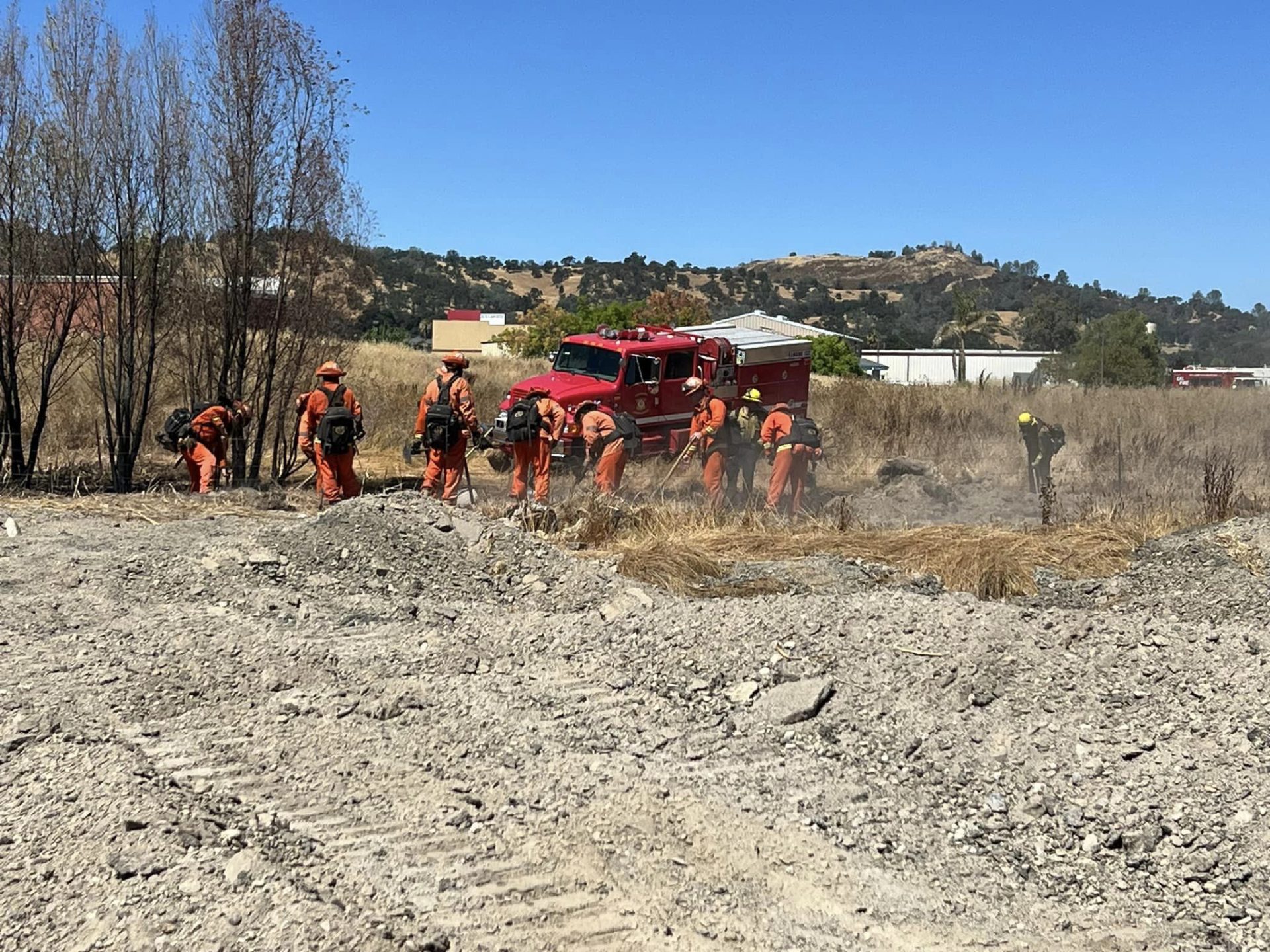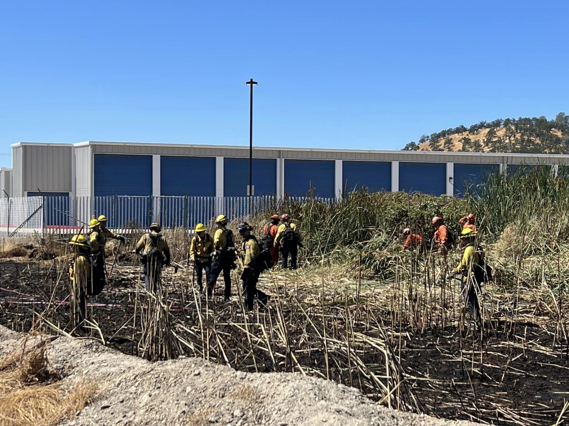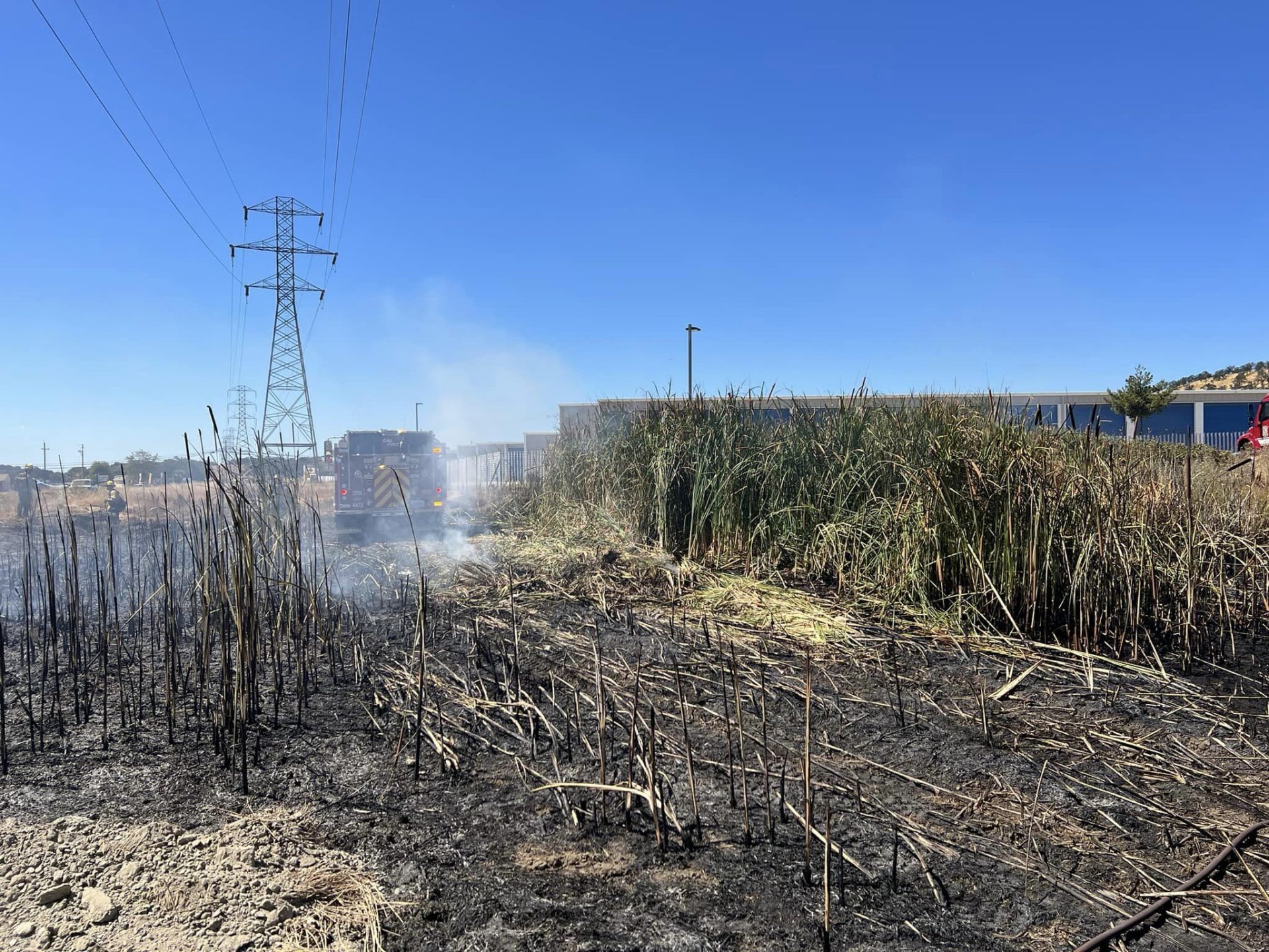 Update at 12:10 p.m.: Fire resources have stopped the forward spread of a grass fire, dubbed the “Nove Fire,” that ignited near several stores. The flames broke out in some grass at 10 Main Street in front of the Valley Springs Feed & Pet Supply near Nove Way, off Highway 26. CAL Fire spokesperson Emily Kilgore reports that the flames’ forward rate of spread was stopped at an estimated one acre. Crews will remain on scene working towards full containment and mopping up for the next hour. What ignited the fire is under investigation.