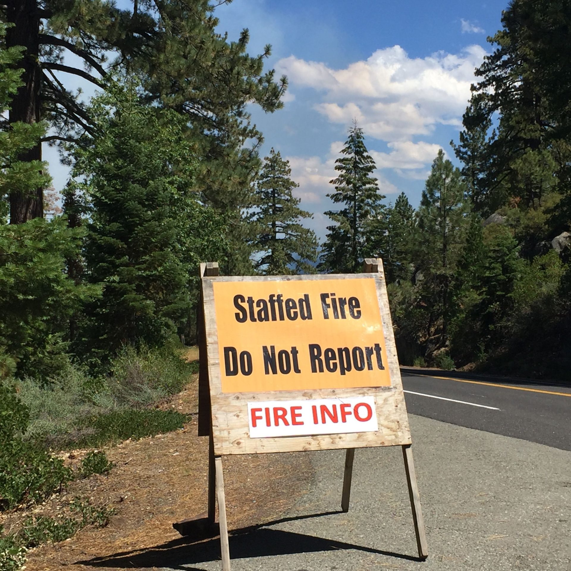 • Sign at Donnell Vista with McCormick Fire burning in the background